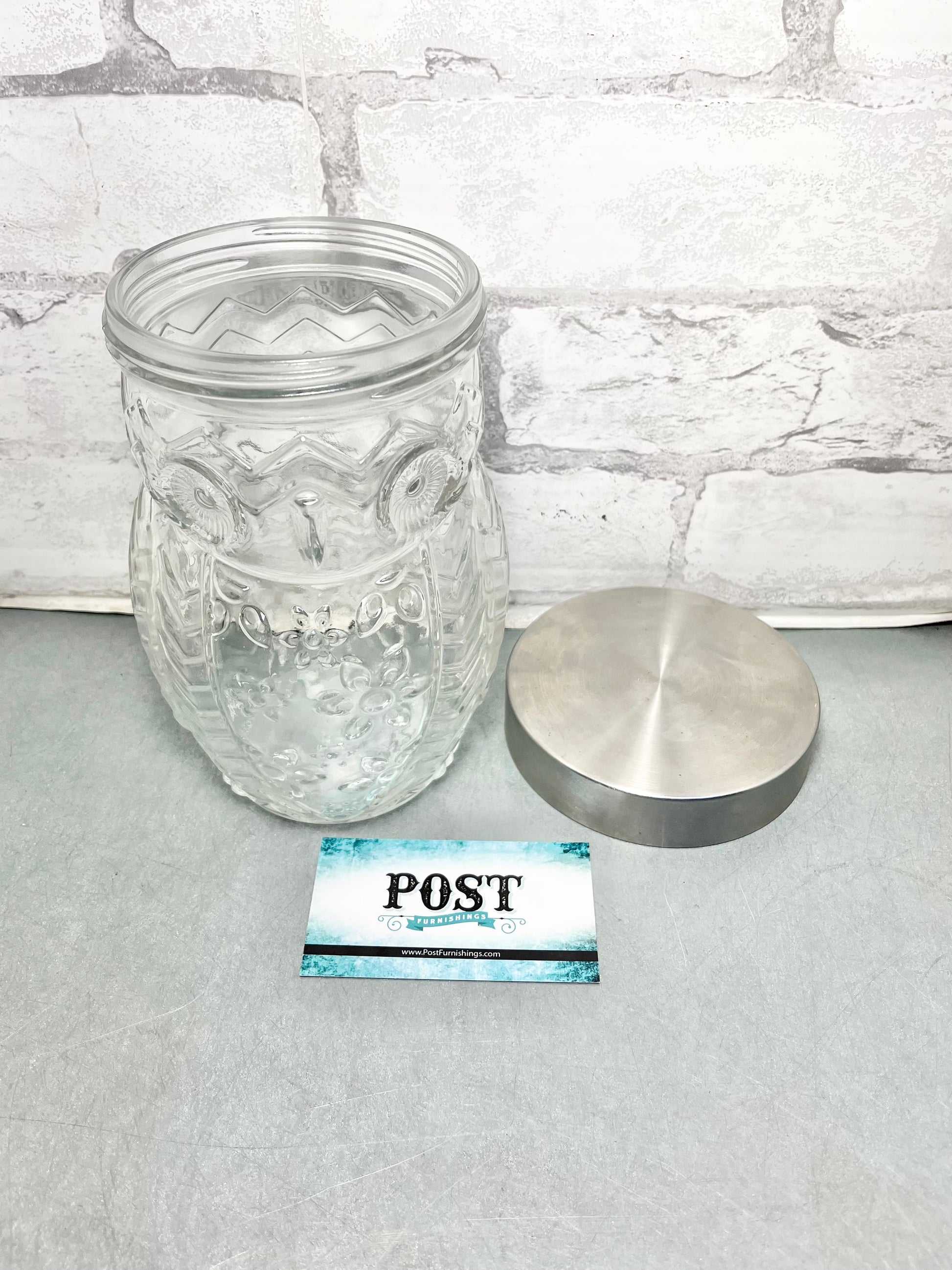Owl Canister Glass Jar W/ Silver Screw On Lid