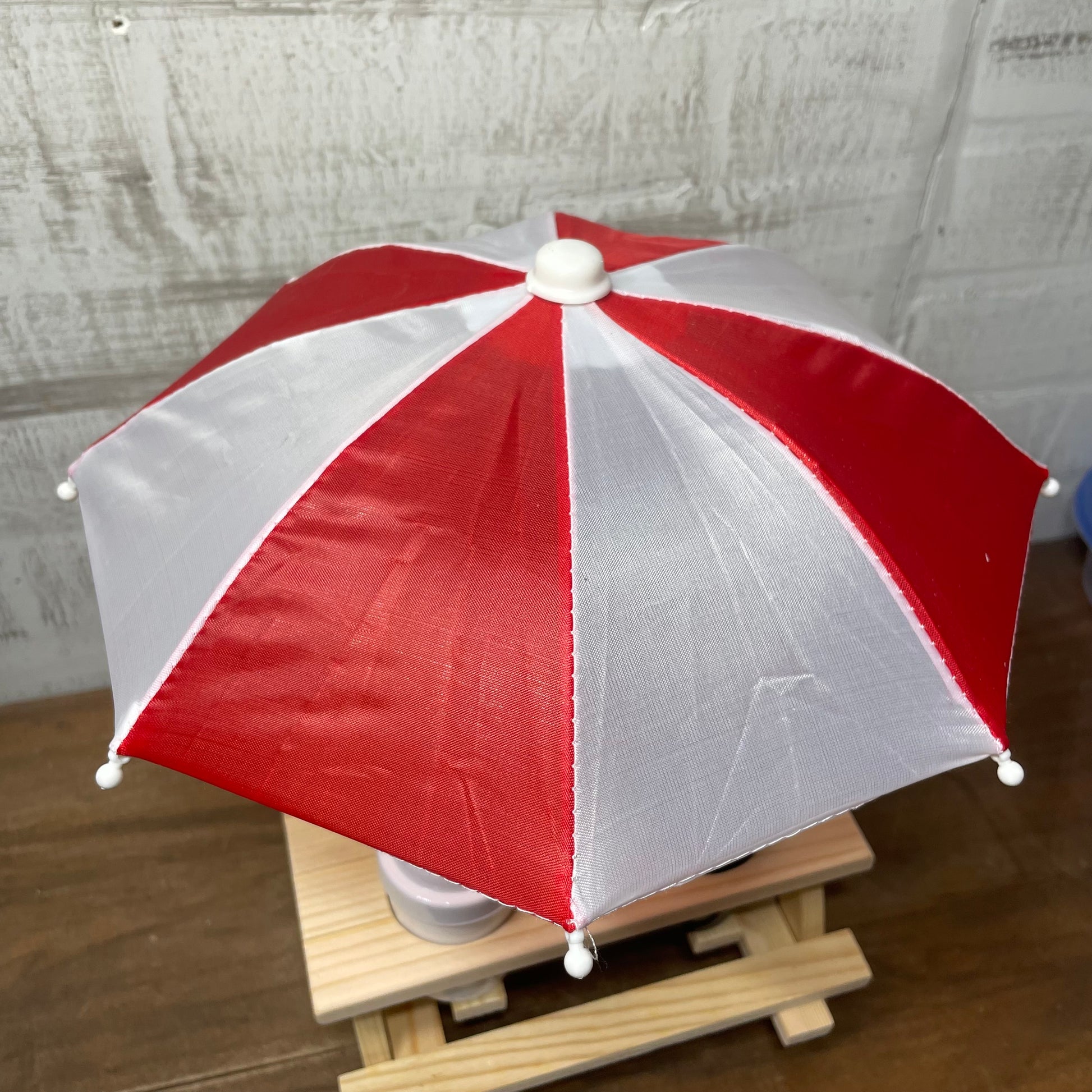 Wooden picnic table, mini umbrella, ketchup and mustard bottles with a salt and pepper shaker set