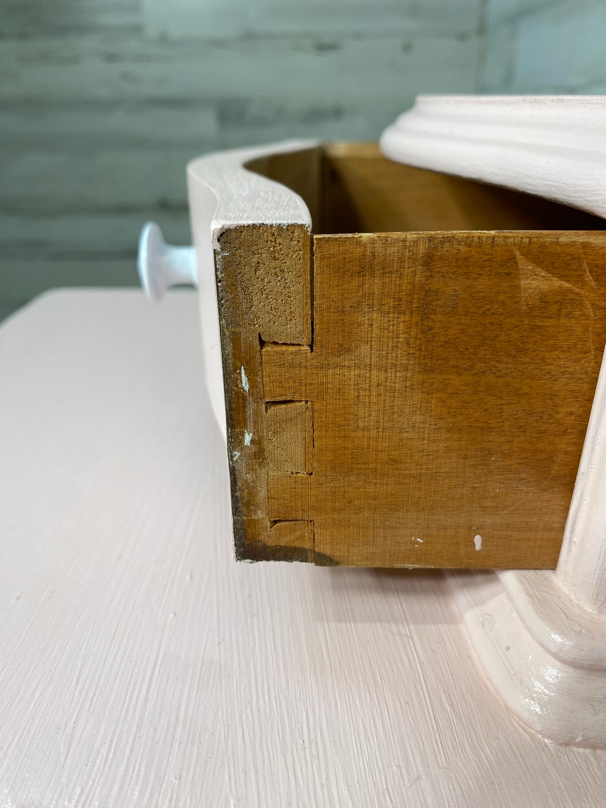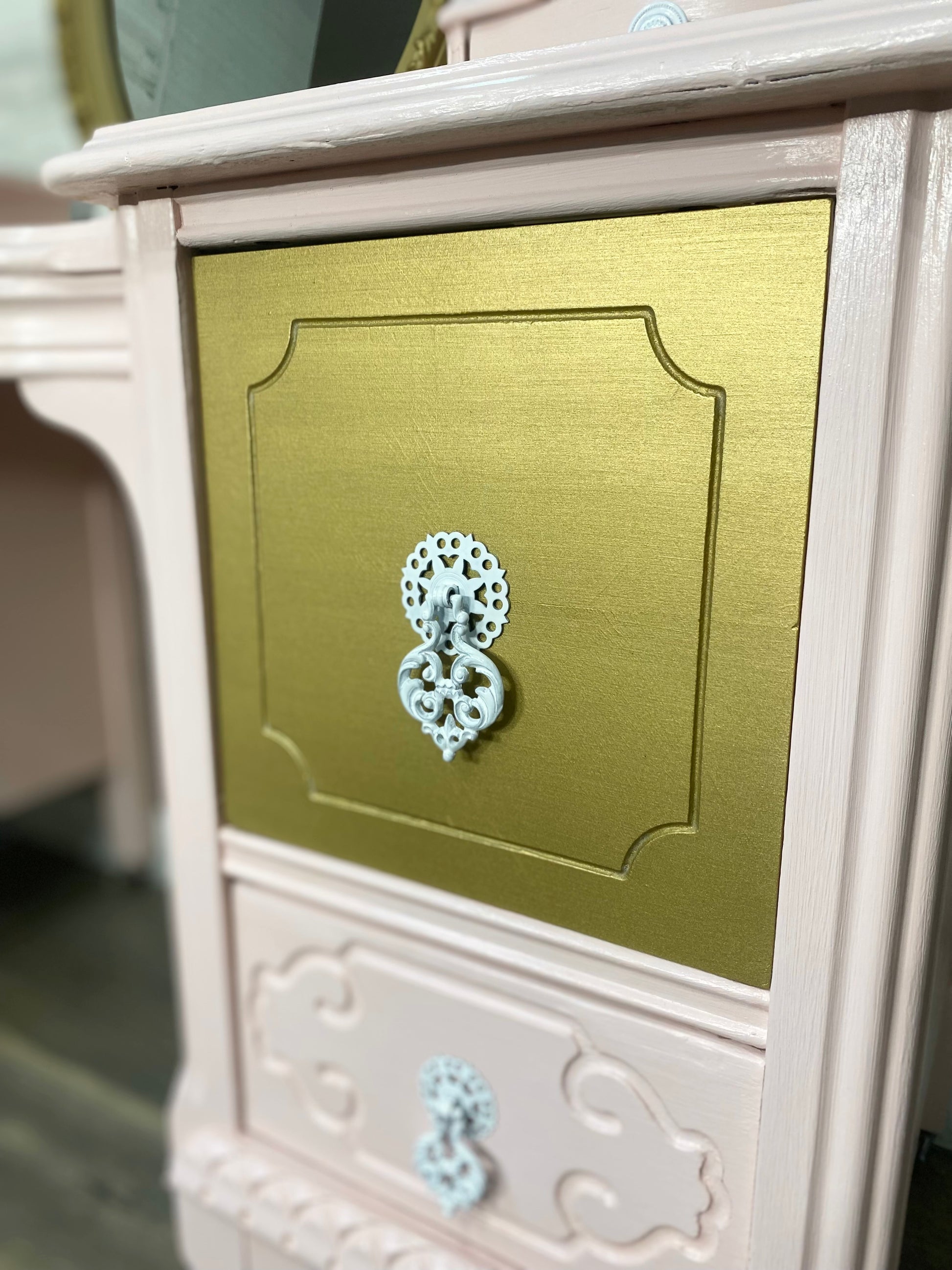 Refinished antique vanity. Comes with matching mirror. Adorable pink and gold color combo. All drawers work properly. Mirror can be hung on a wall if you prefer.