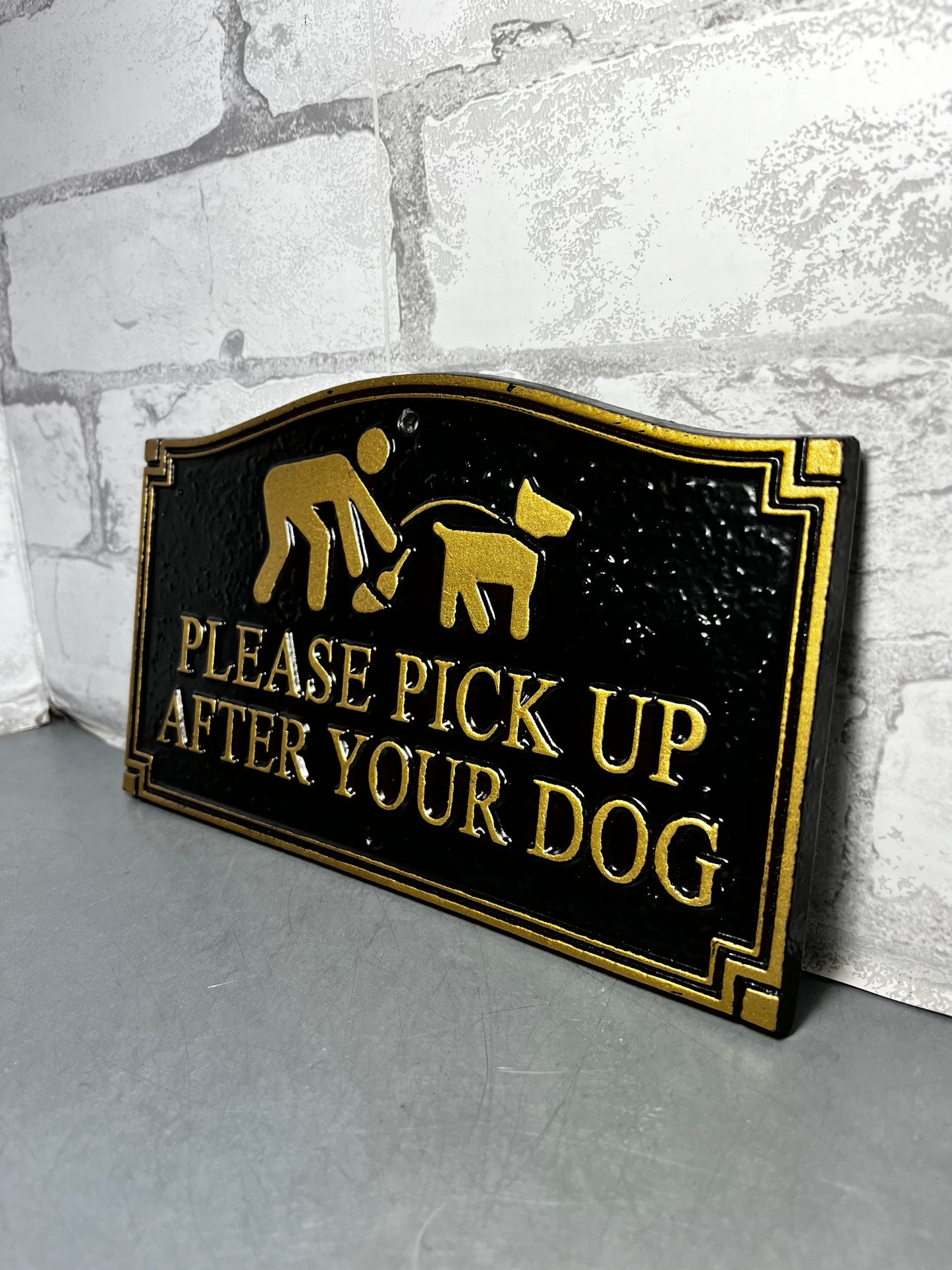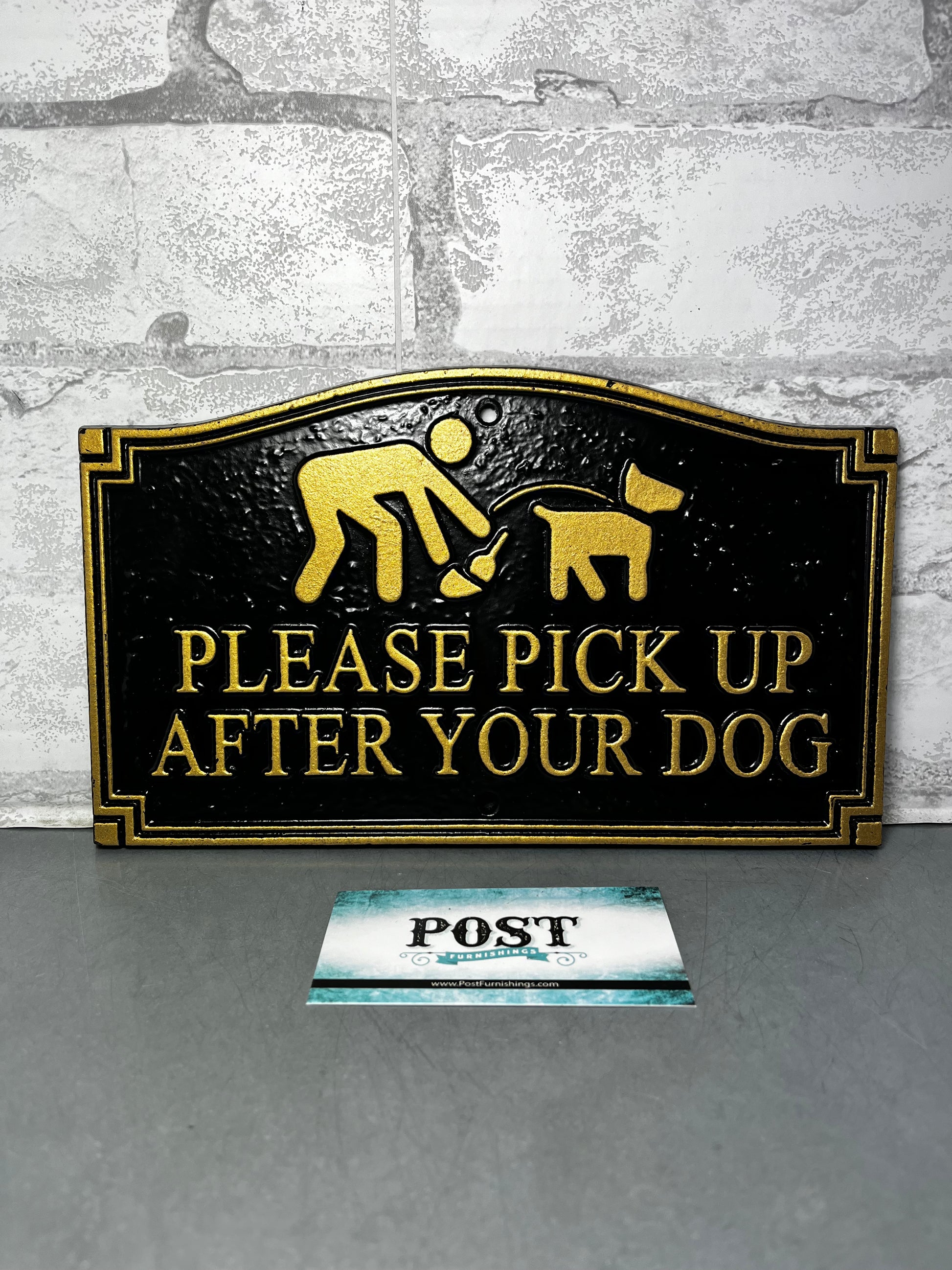 This sign will surely get people’s attention to pick up after their dogs. The sign is made of metal and has two holes to make it easy hang it up. The measurements are 9.5’ by 6’.