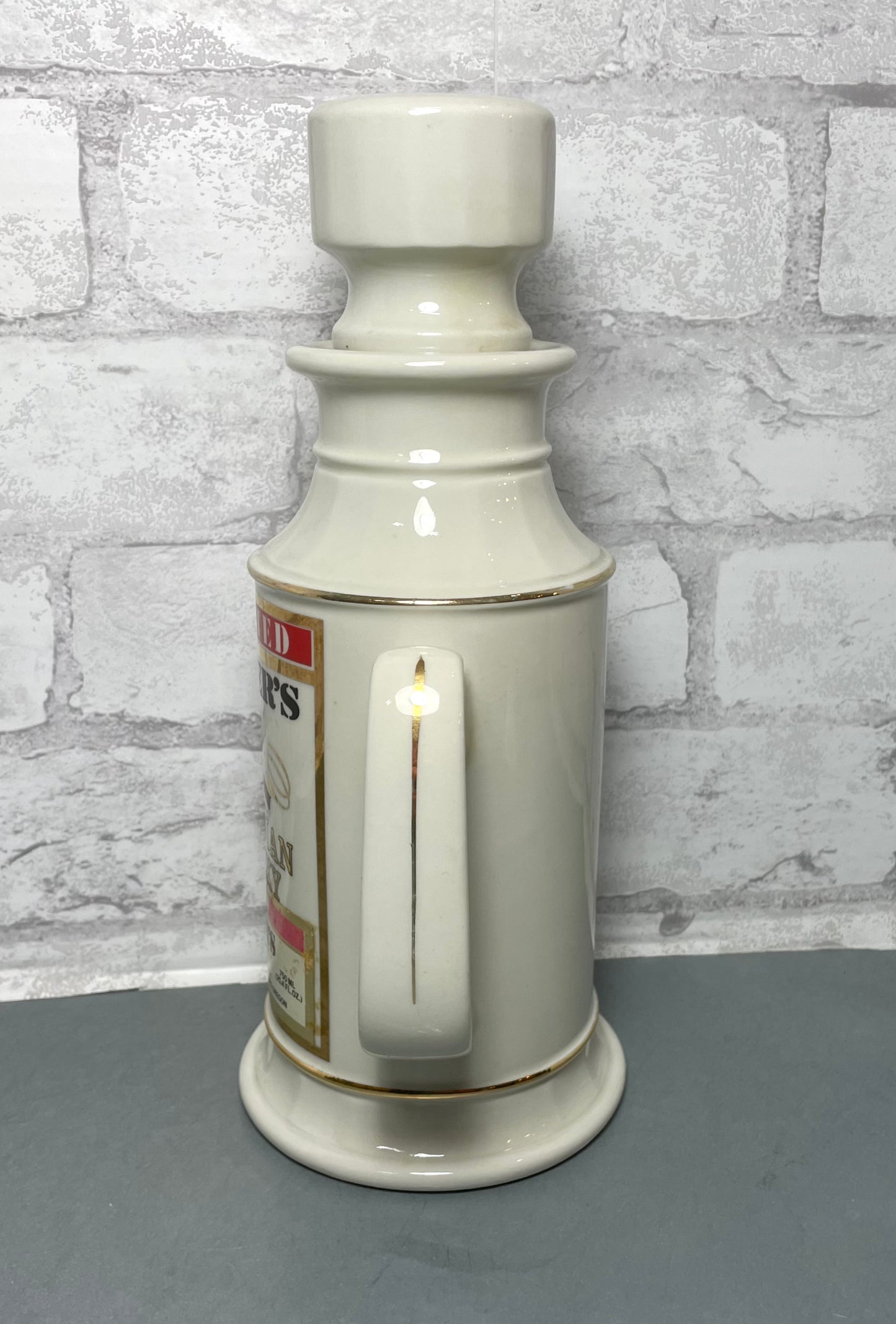 This Potter's Canadian Whiskey bottle decanter is a unique and collectible piece that combines the world of pottery and whiskey. Crafted with precision and attention to detail, it showcases a distinctive design that pays homage to the rich heritage of Canadian whiskey.