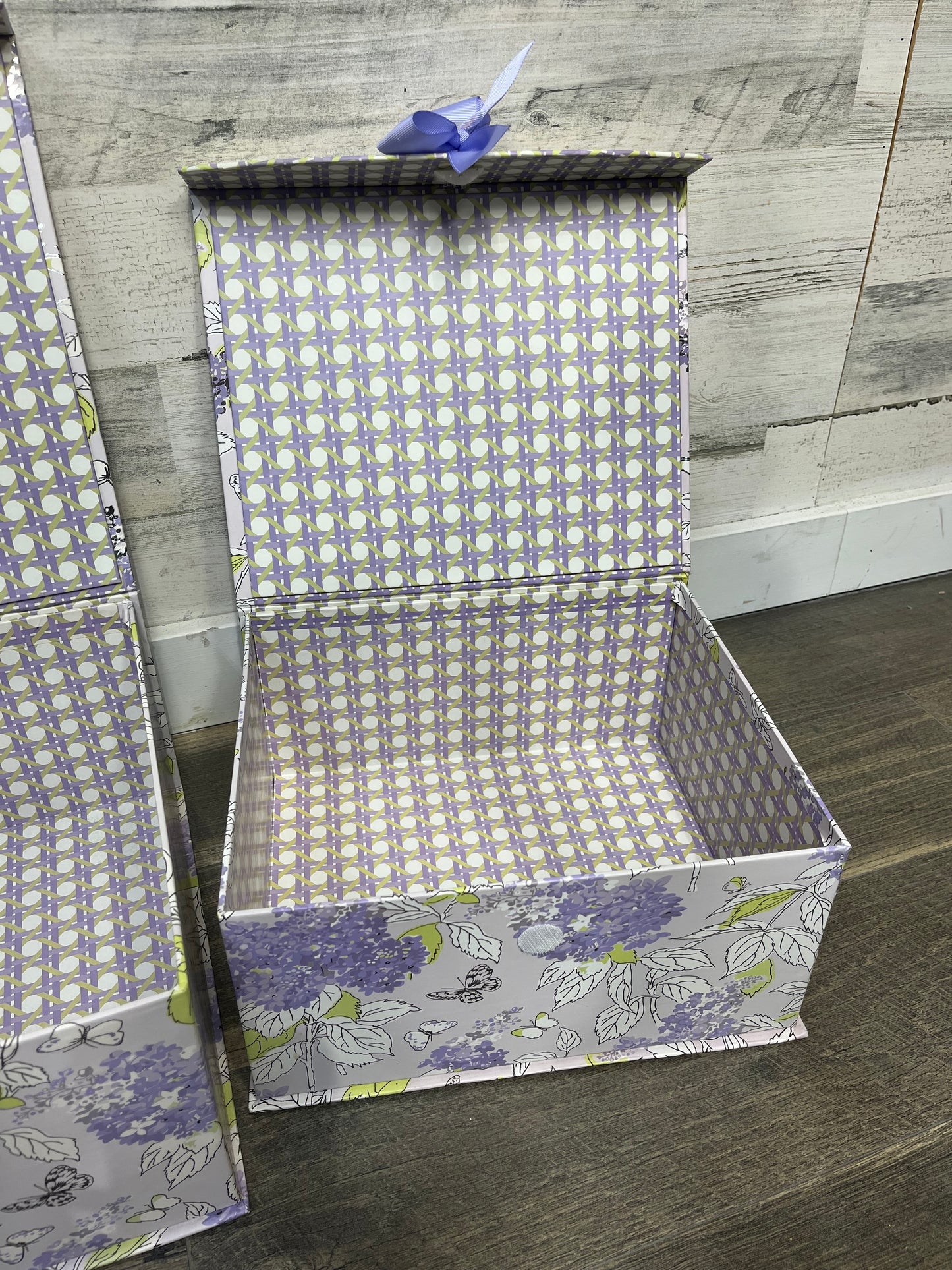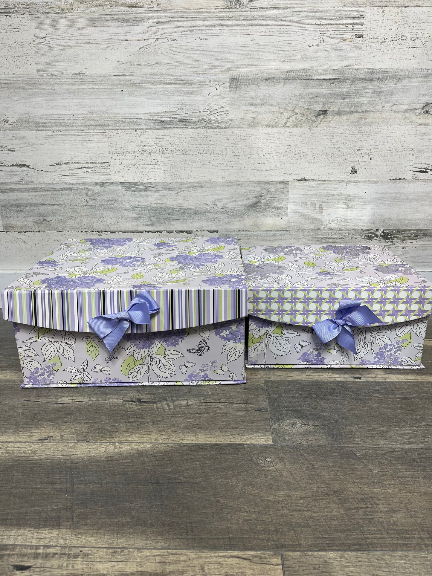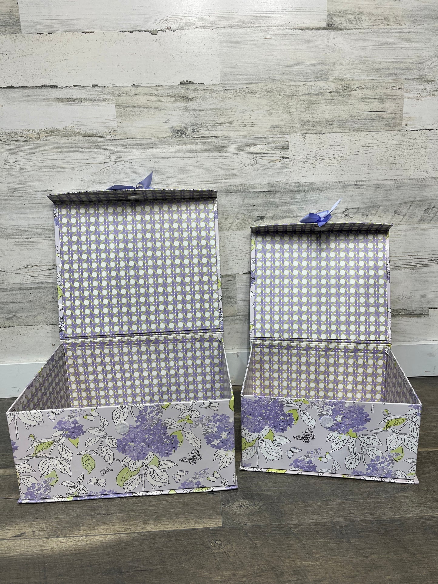 This set of two keepsake/ gift boxes are a beautiful mix of purples, greens and whites, beautiful details, has Velcro snaps, the large box is 12” long, 14” wide, 7” deep, the small box is 10” long, 12” wide, 6” deep