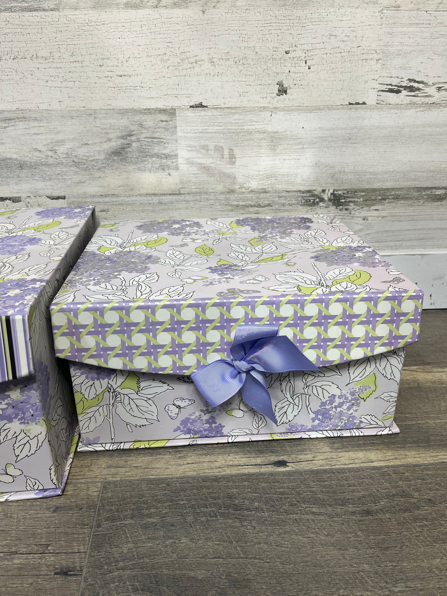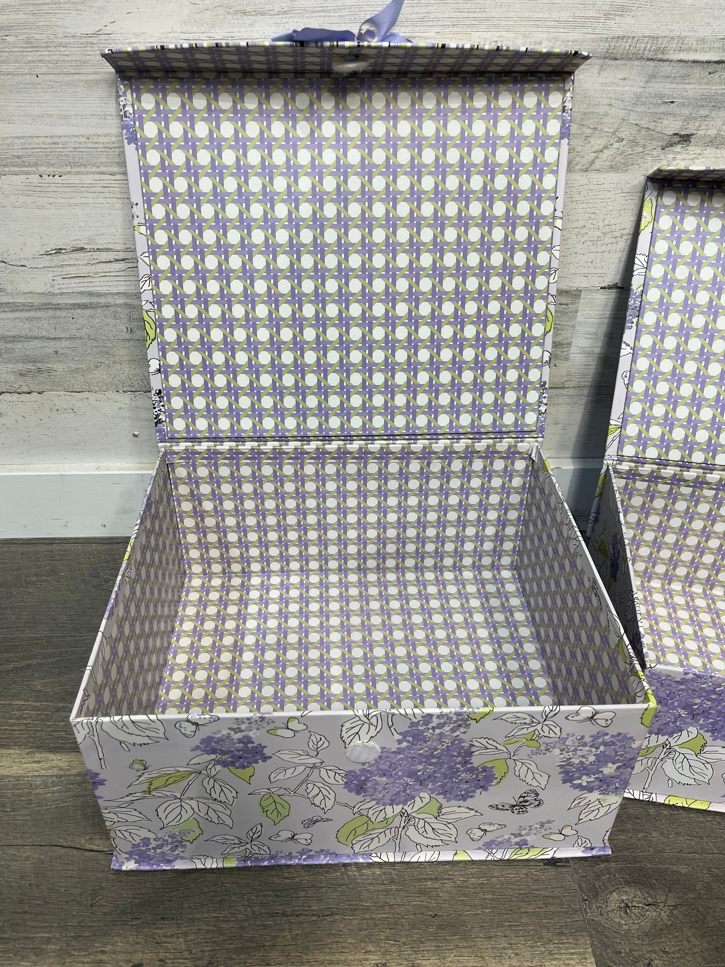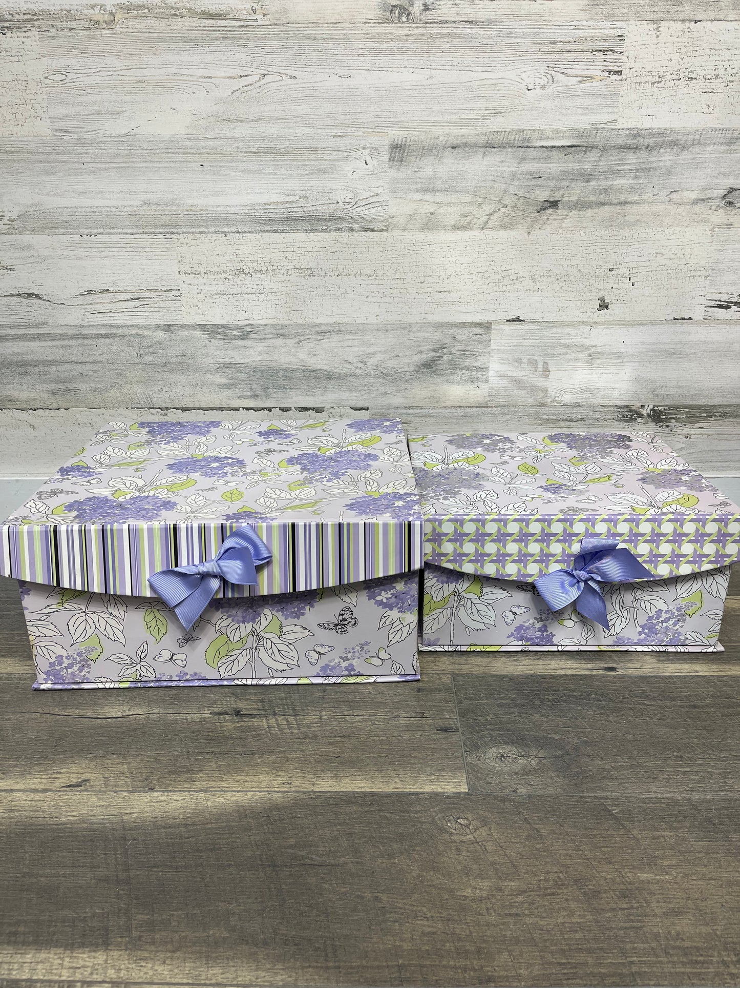 This set of two keepsake/ gift boxes are a beautiful mix of purples, greens and whites, beautiful details, has Velcro snaps, the large box is 12” long, 14” wide, 7” deep, the small box is 10” long, 12” wide, 6” deep