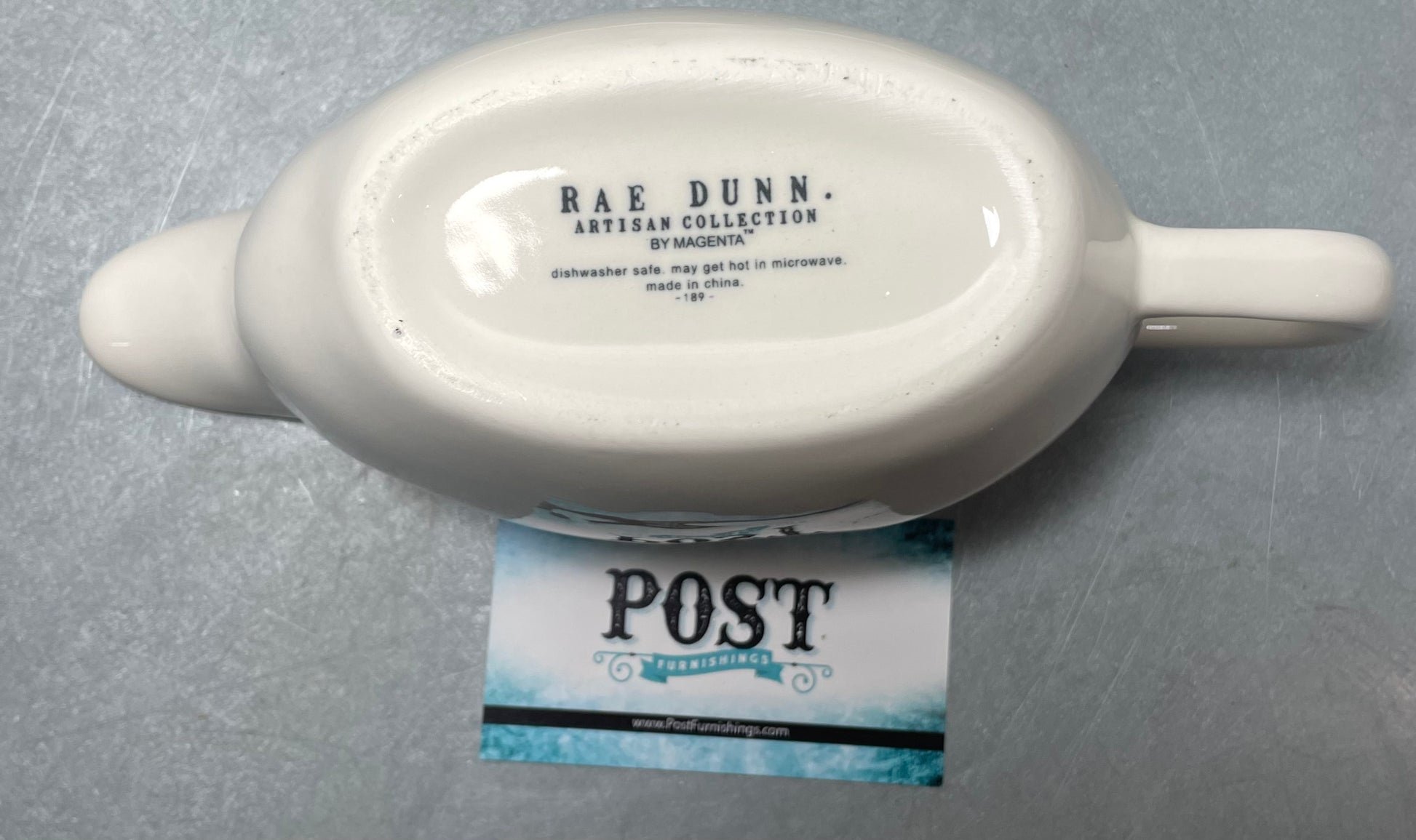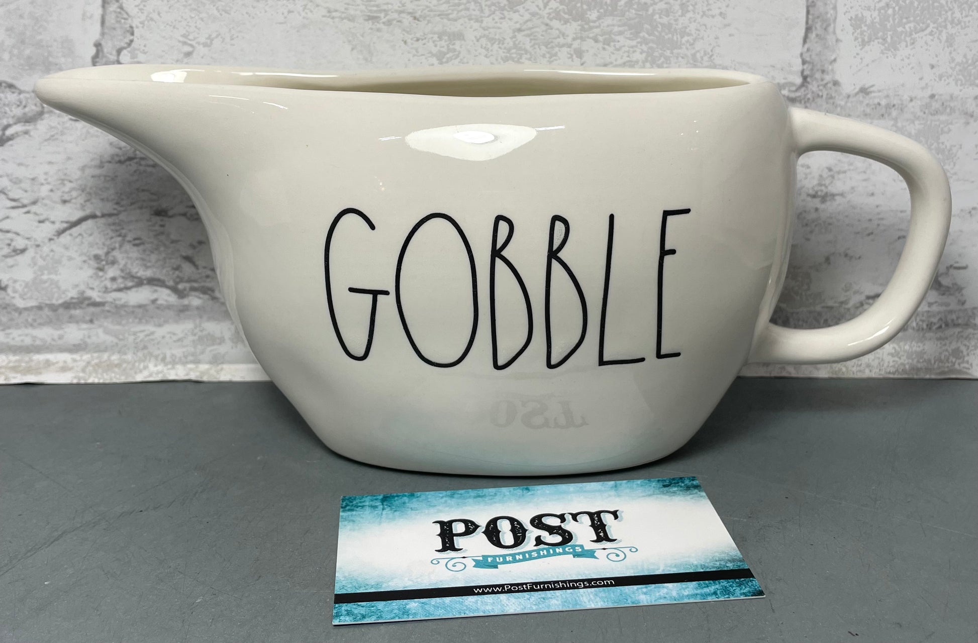 Ceramic Rae Dunn gray boat with the word “Gobble” on the front