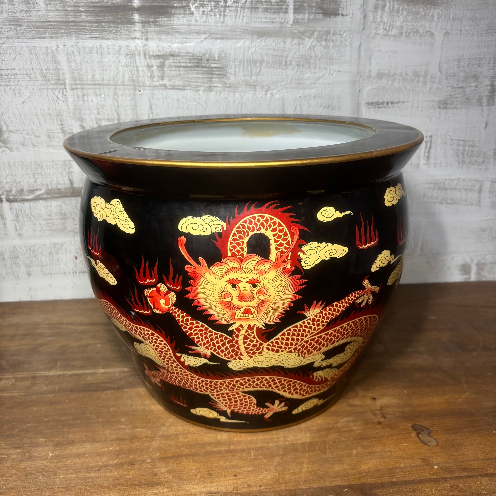 rare Bombay brand oriental design of two dragons red, gold & black porcelain Fishbowl/ planter pot, some marks can be seen in photos, 11” deep, 13.5” wide, 10” opening