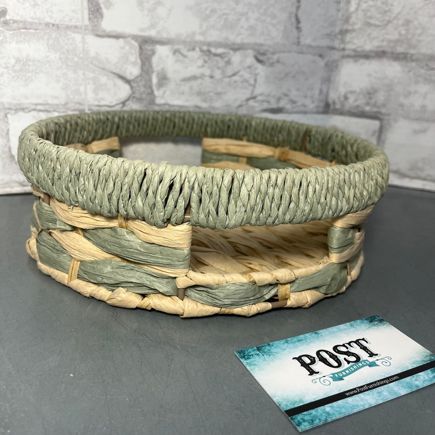 Made out of woven Seagrass paper material, on a metal frame, display on your coffee table, entryway etc, sage green and tan coloring, it is 9.5” wide, 3” tall