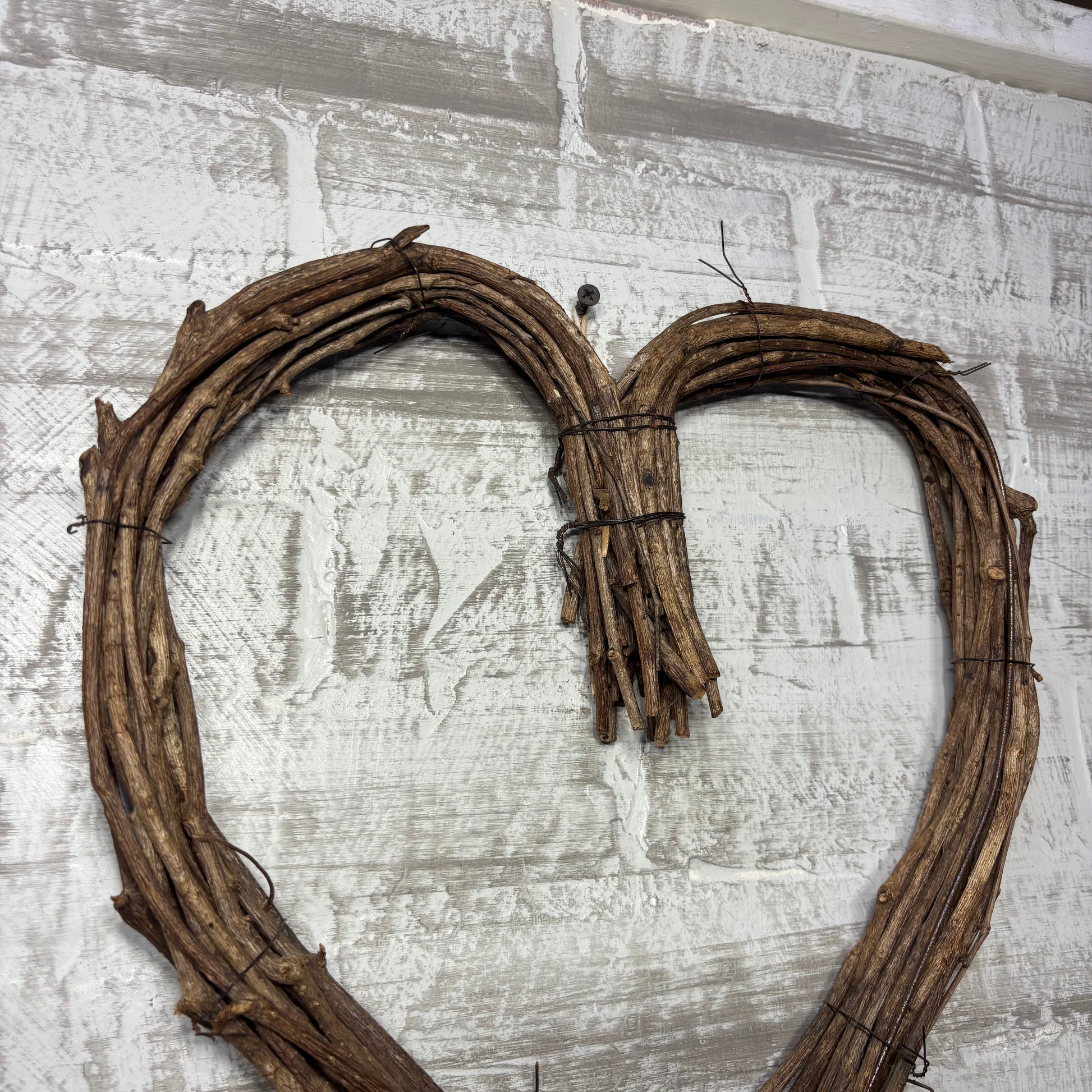 Grapevine wood twigs wrapped into a heart shape, indoor or outdoor decor,