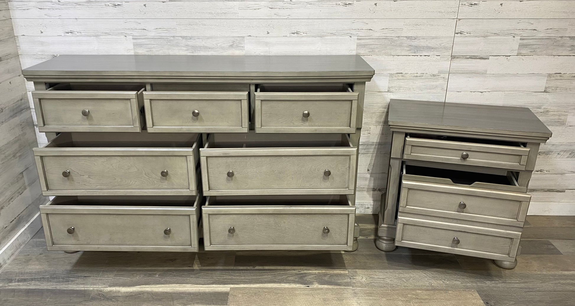 Ashley furniture brand dresser set. Comes with 1 large dresser and 1 matching nightstand. Top surfaces have been restored and are in new condition. Drawers all slide smoothly. Very heavy and well built.