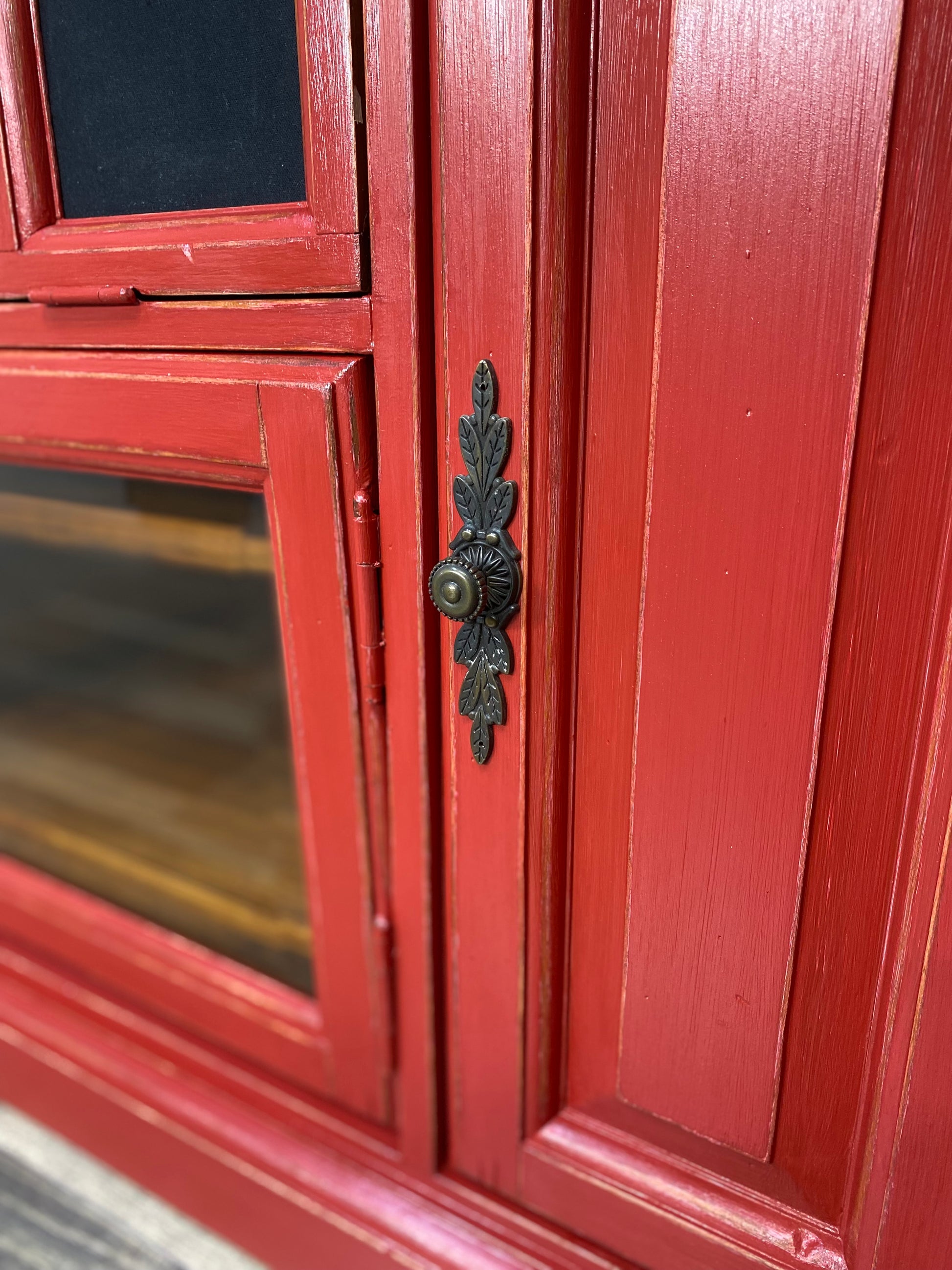 Rustic red wood tv stand. Lots of storage space and a bright cheerful center piece for a living room. Lightly distressed, heavy and very sturdy.
