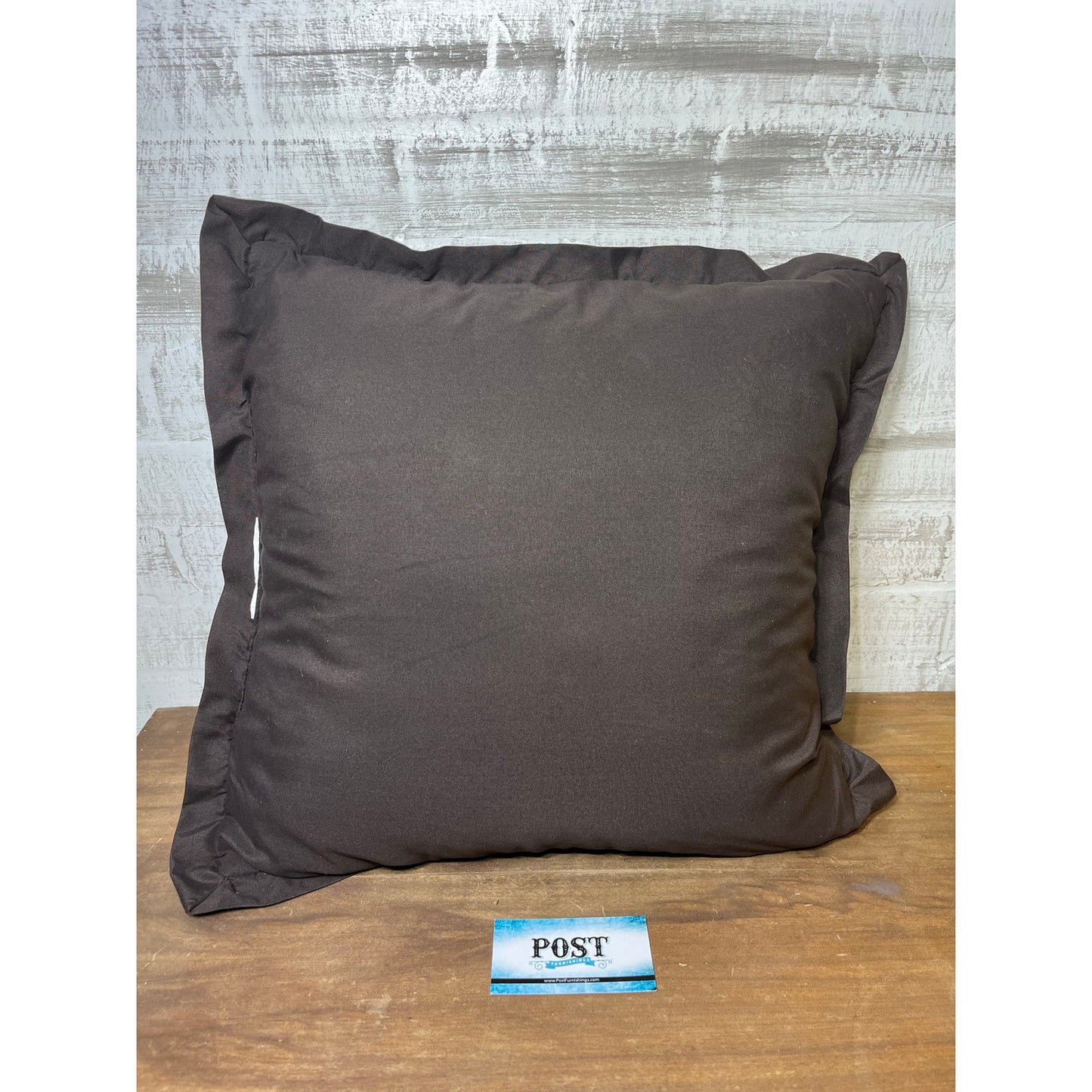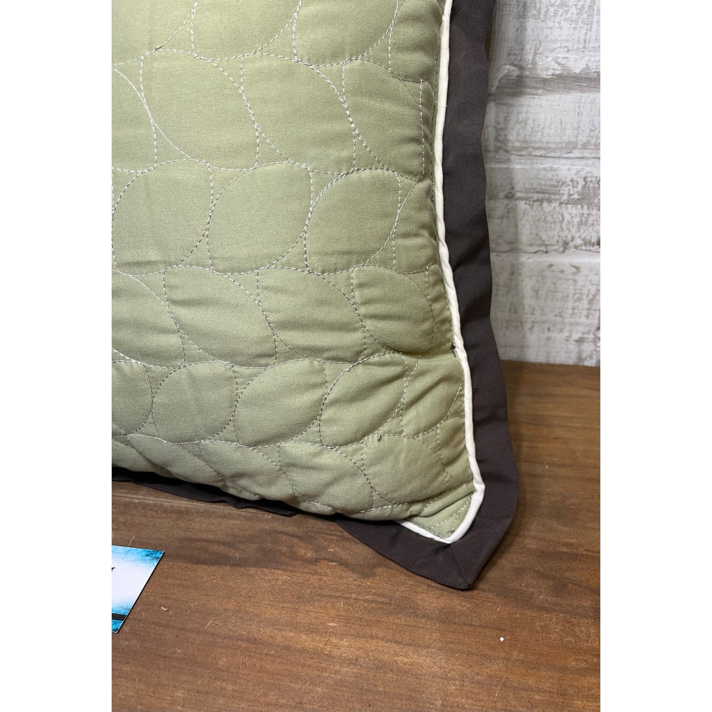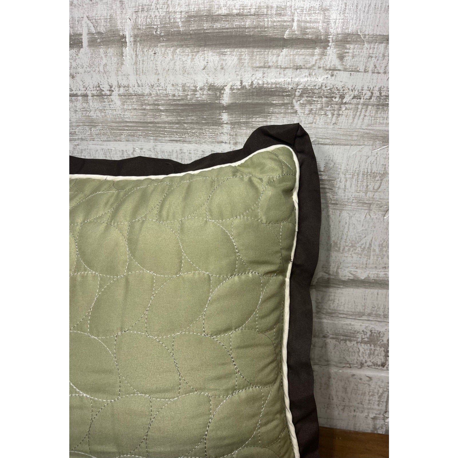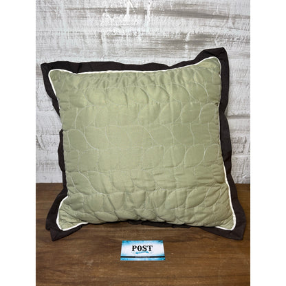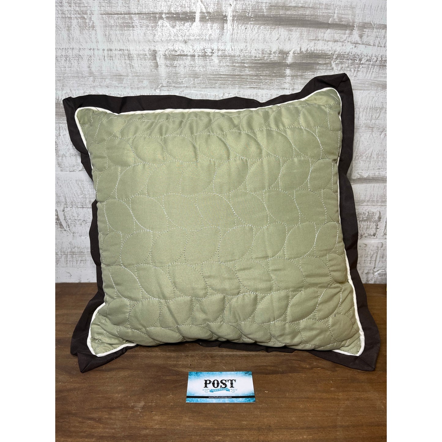 Sage green pillow with a quilted textured surface with a leaf-like pattern created by stitching, and has a contrasting brown border with white piping, it is 16” by 16”