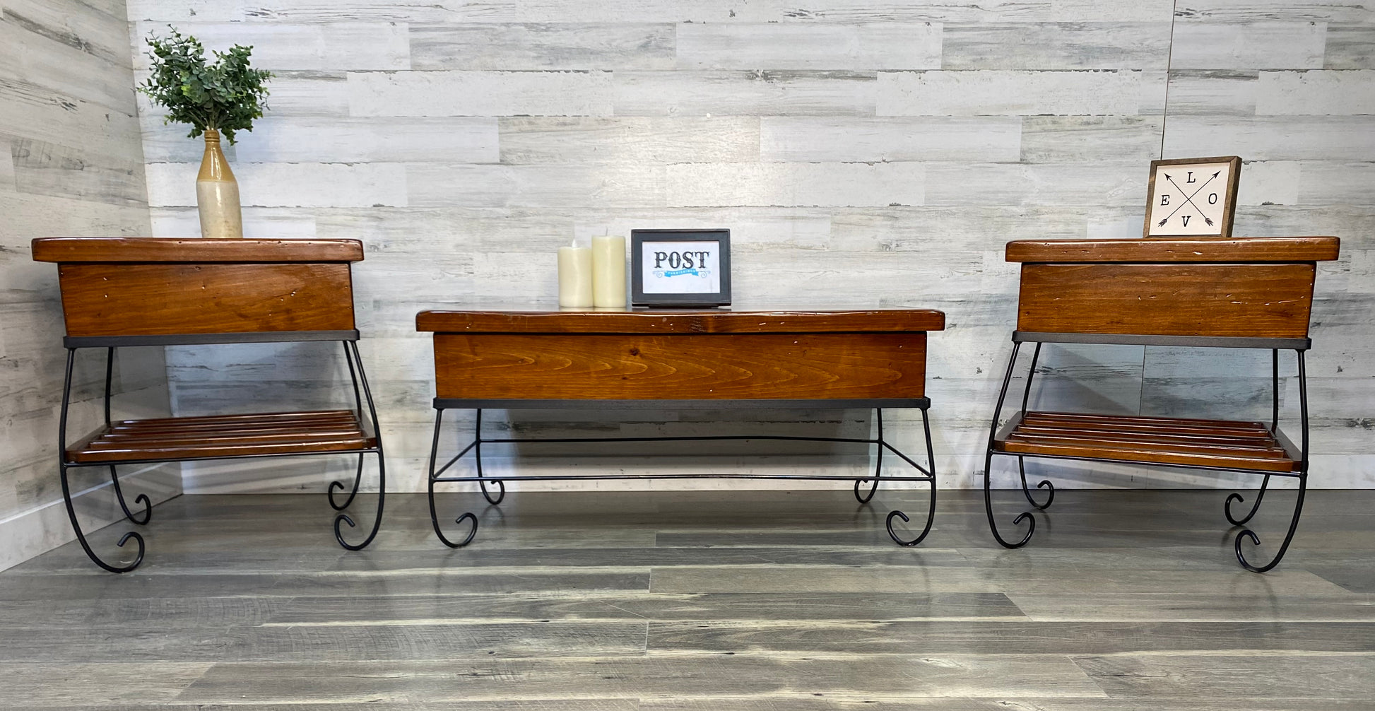 Set of 3 living room tables. Coffee table and 2 end tables. Each table opens with storage inside. Rustic wood with wrought iron legs.