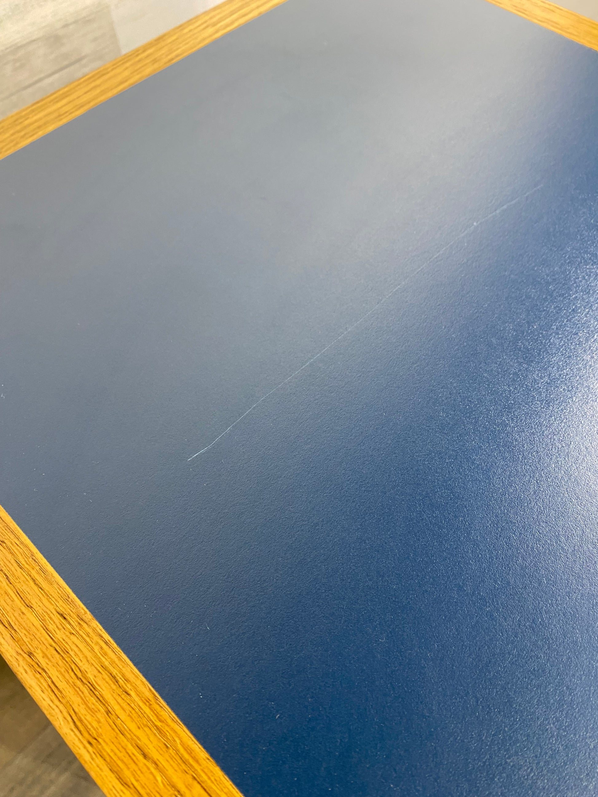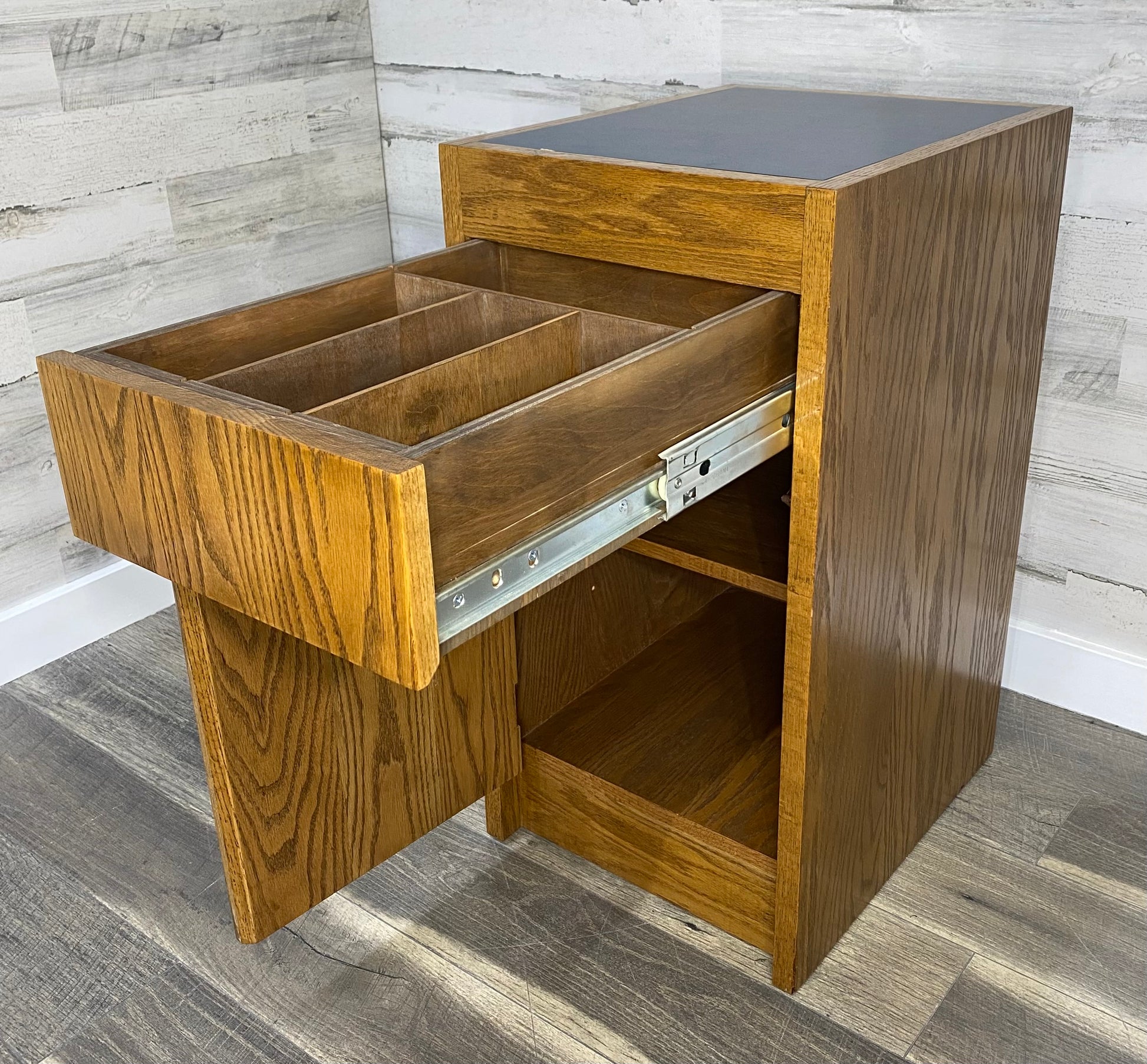 Small oak end table cabinet. Great for bedroom, office, or livingroom! Very heavy for its size. Top is Formica and has a scratch- see pic. Doors open with a push click magnet.