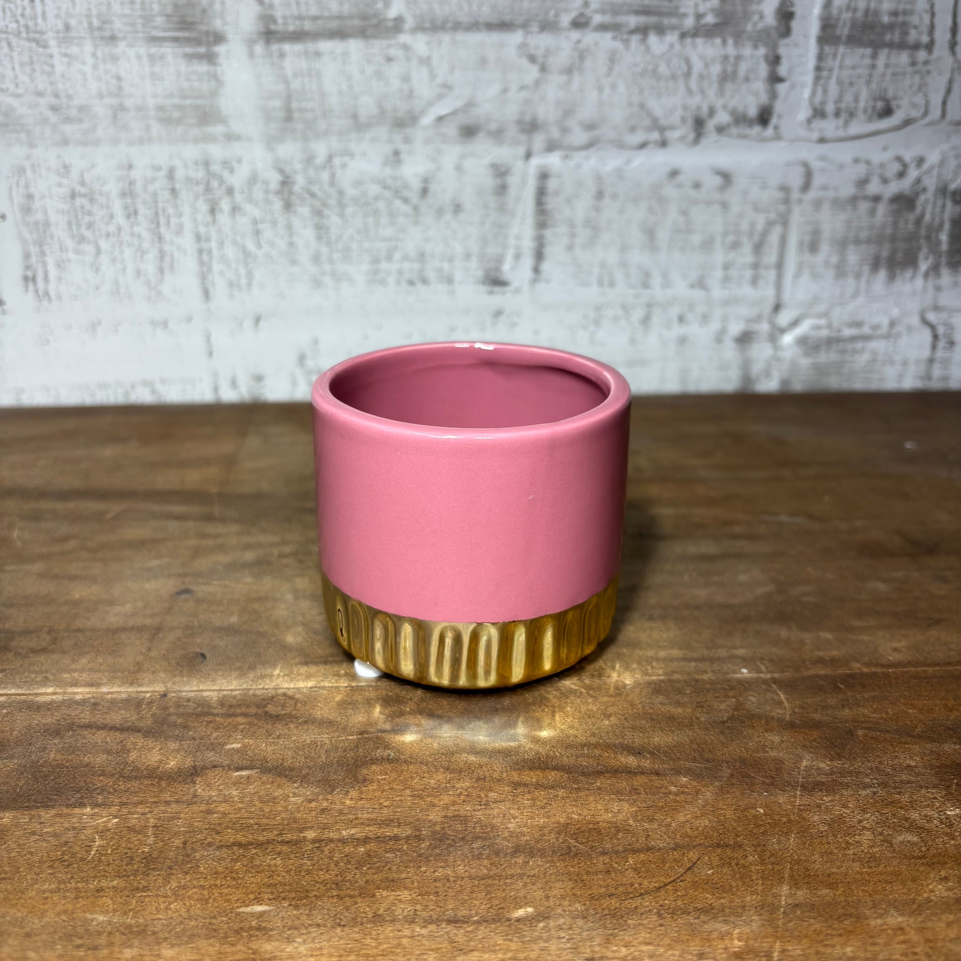 Small pink with gold ribbed bottom planter pot, 3” wide, 2.5” tall