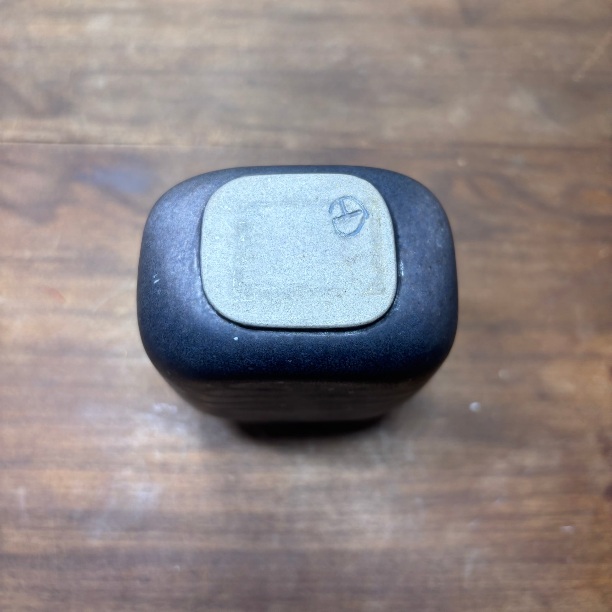 Dark glazed stoneware stamp signed small bud vase, 4” tall, 2.5” wide 1” opening
