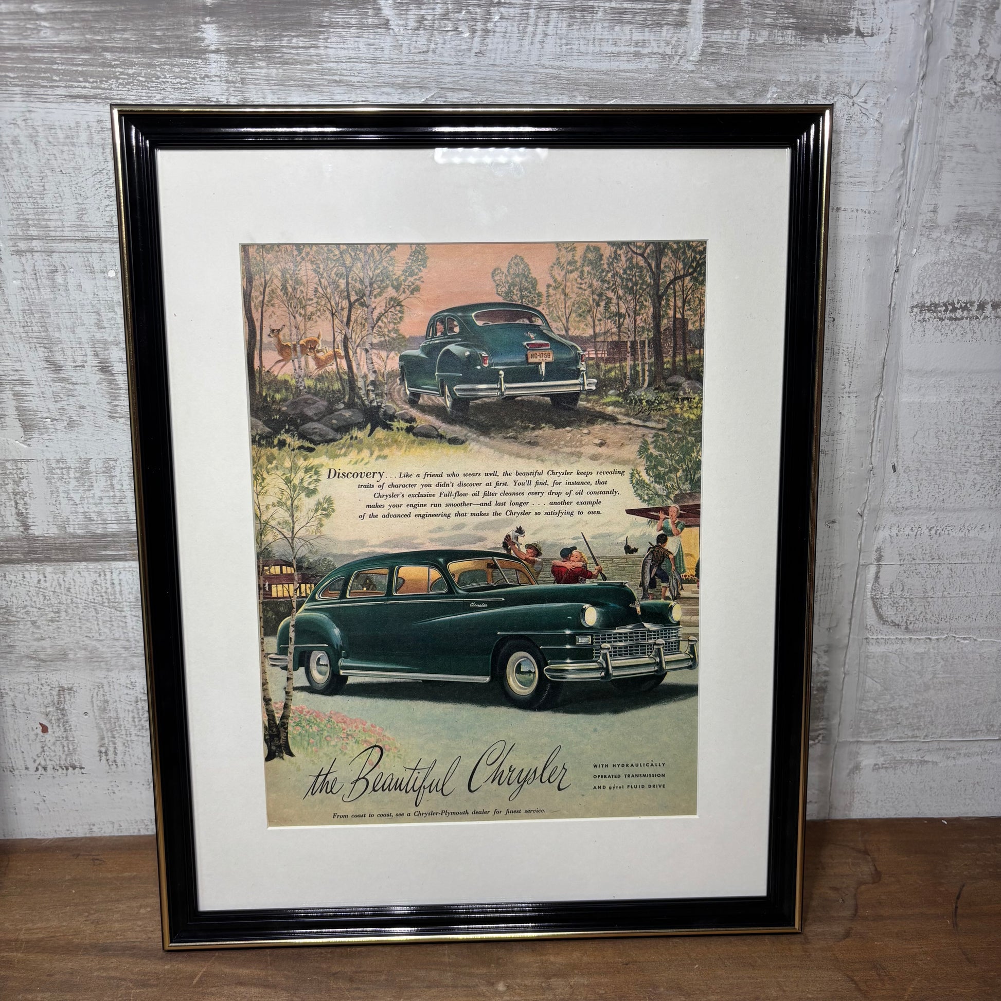 Vintage automobile paper 1946-1947 advertisement “The Beautiful Chrysler” framed in a matted black with gold trim frame, 12” by 15”
