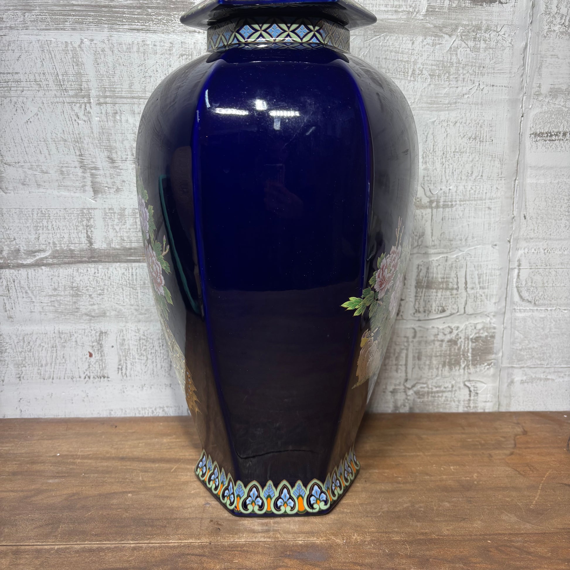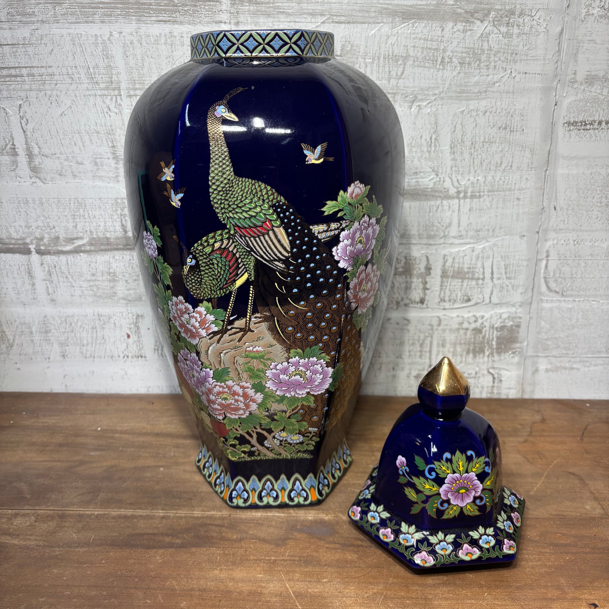 Vintage peacock floral design cobalt ceramic vase with a lid, has a scratch, made in Japan, 19.5” tall, 7” wide