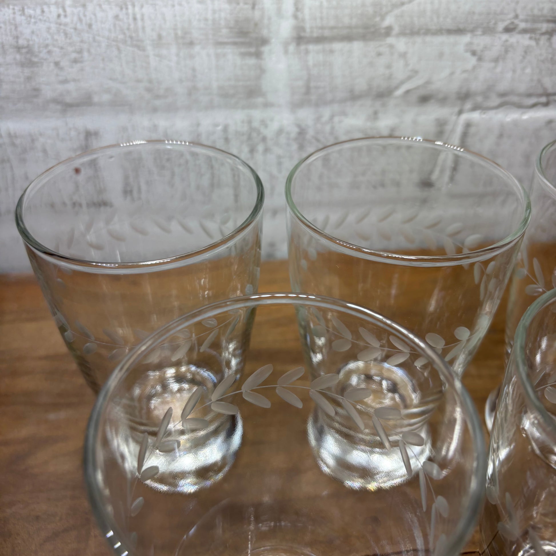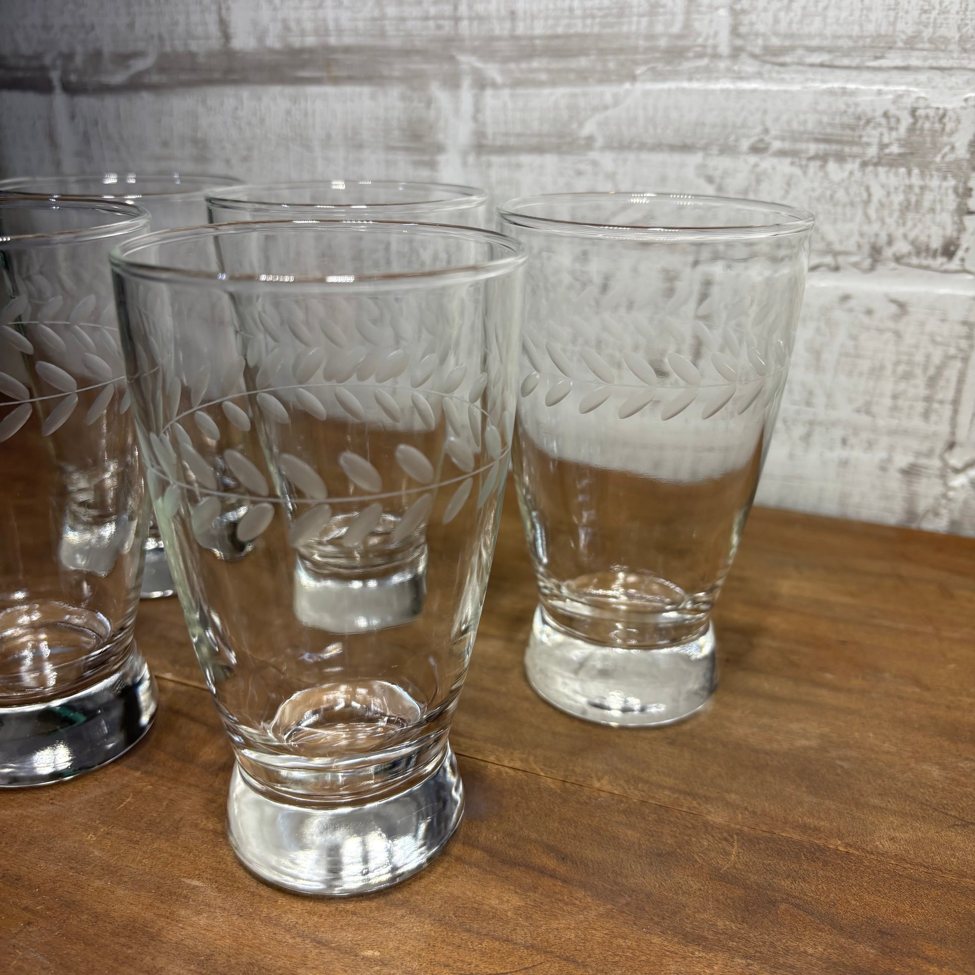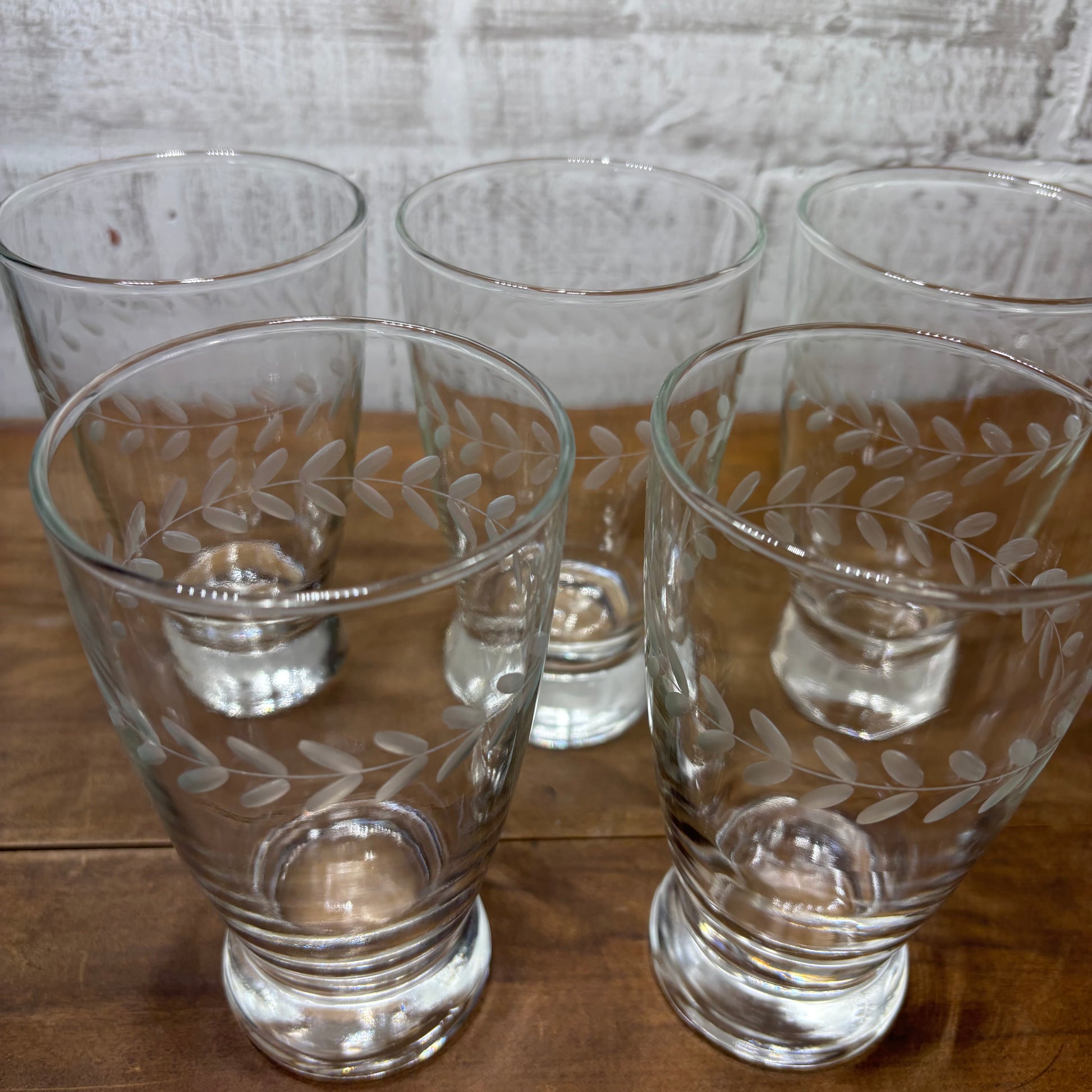 Set of five etched laurel Leaf design, made by the brand Anchor Hocking, footed tumblr style solid glasses, 5.5” tall, 3” diameter