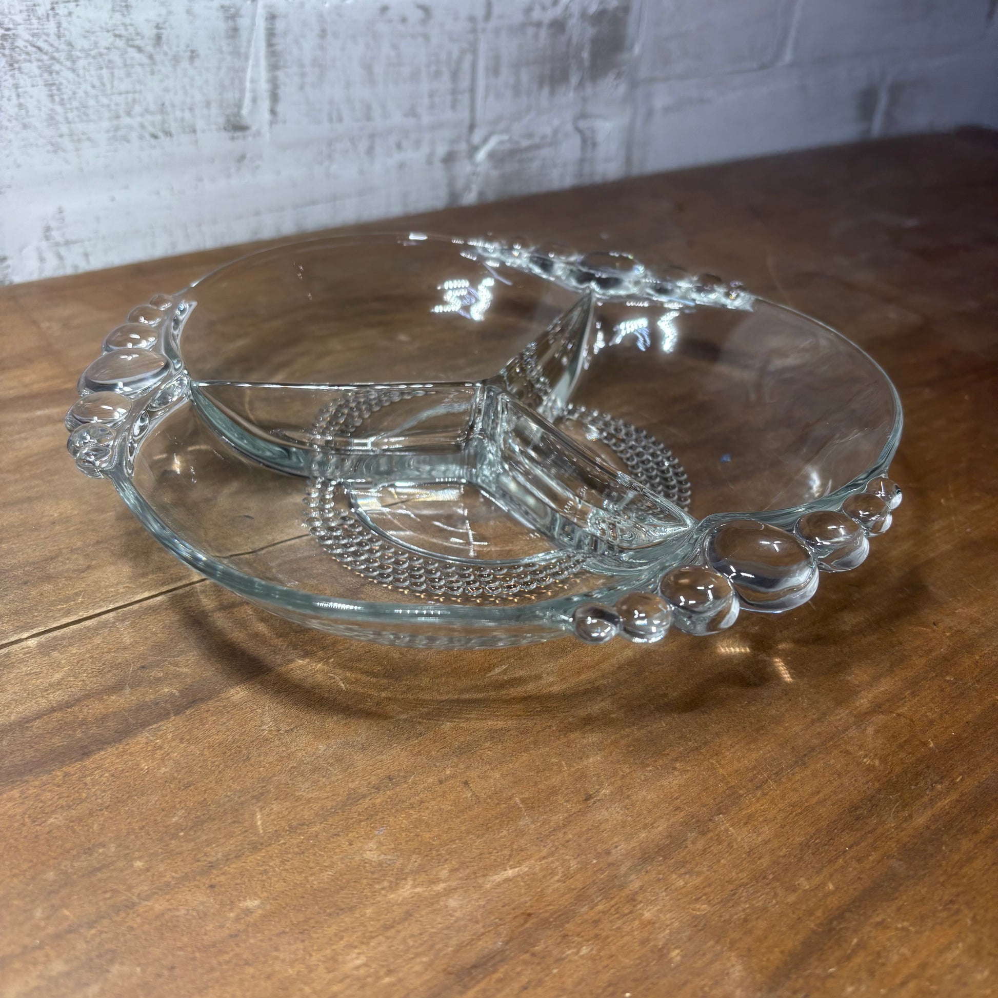 Solid glass “Tear Drop” Duncan and Miller three section candy/ nut dish, 8” wide, 1.5” deep