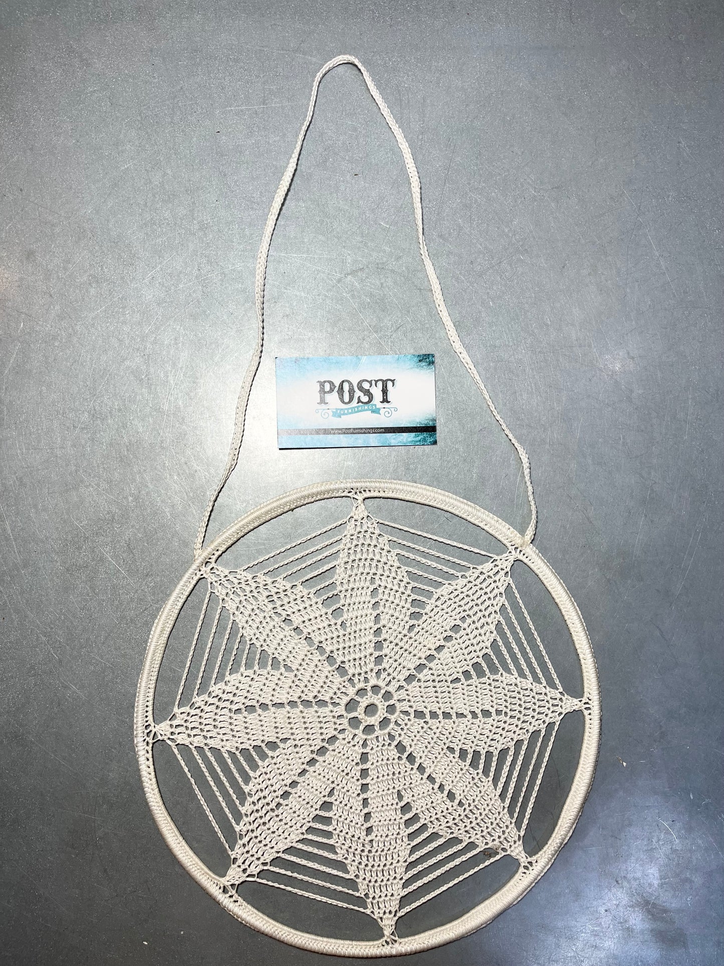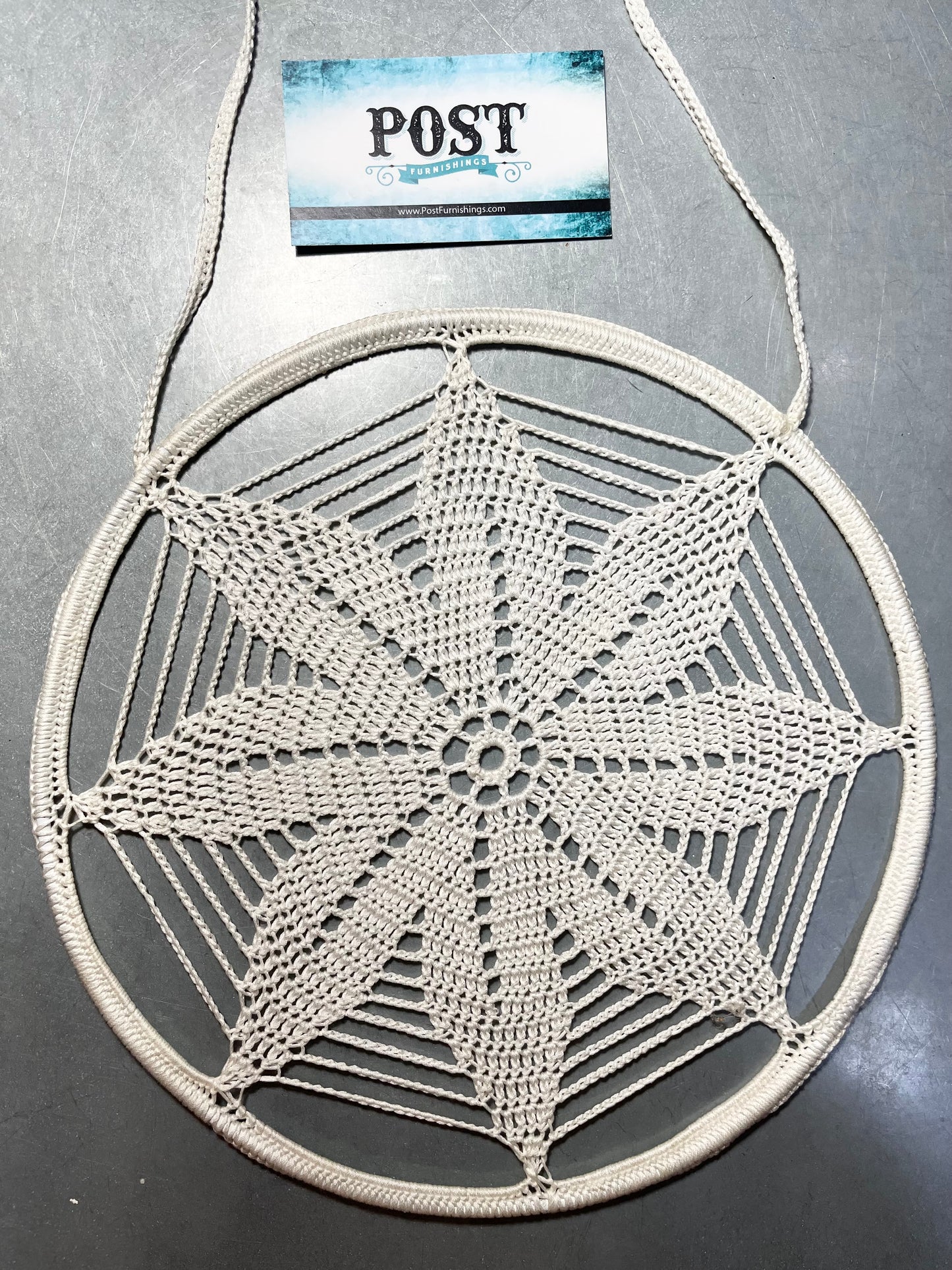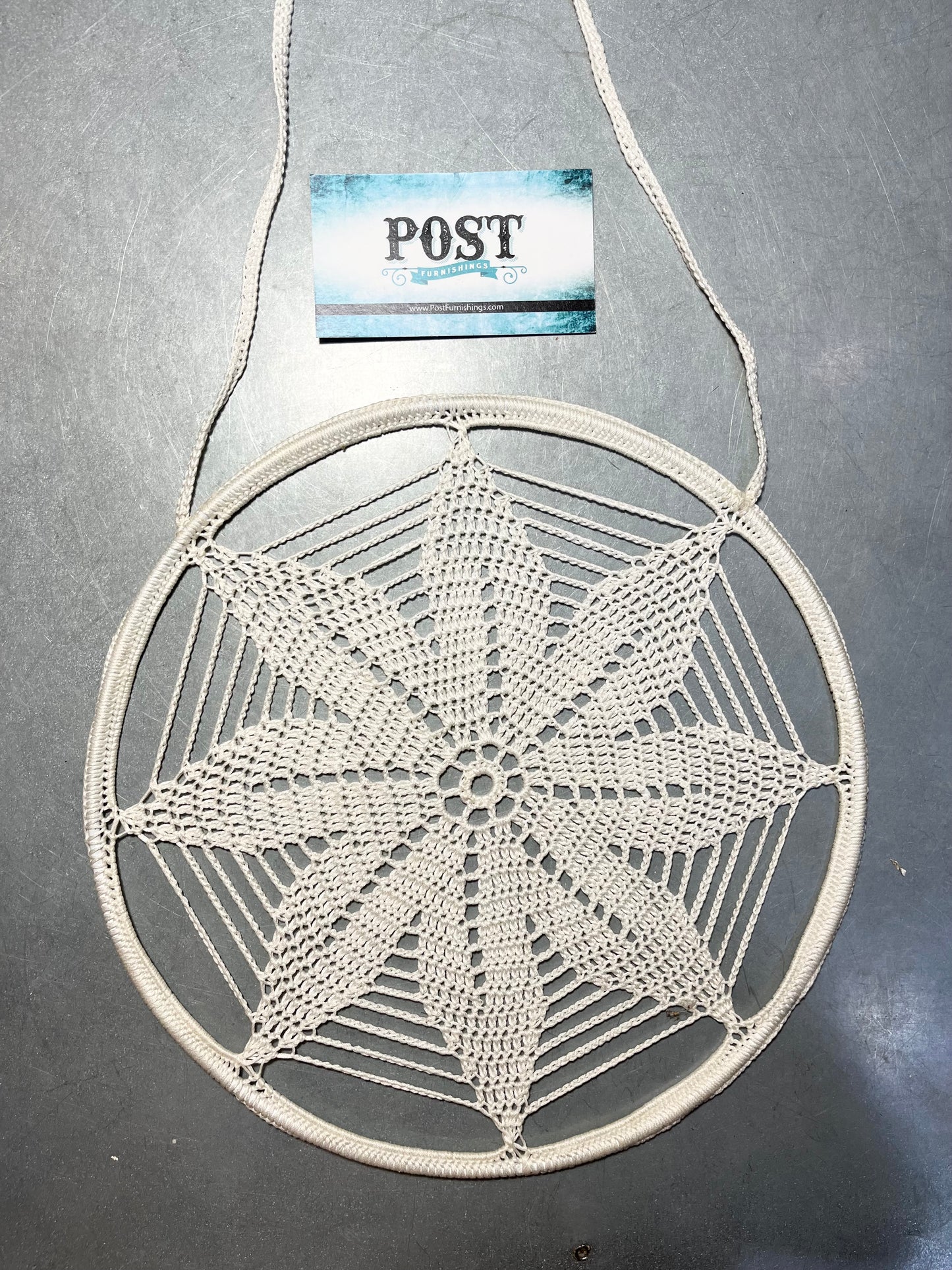 Handmade crochet white yarn mandala, metal wire to keep its shape, it can be hung on the wall, it is 10” diameter, 21” long