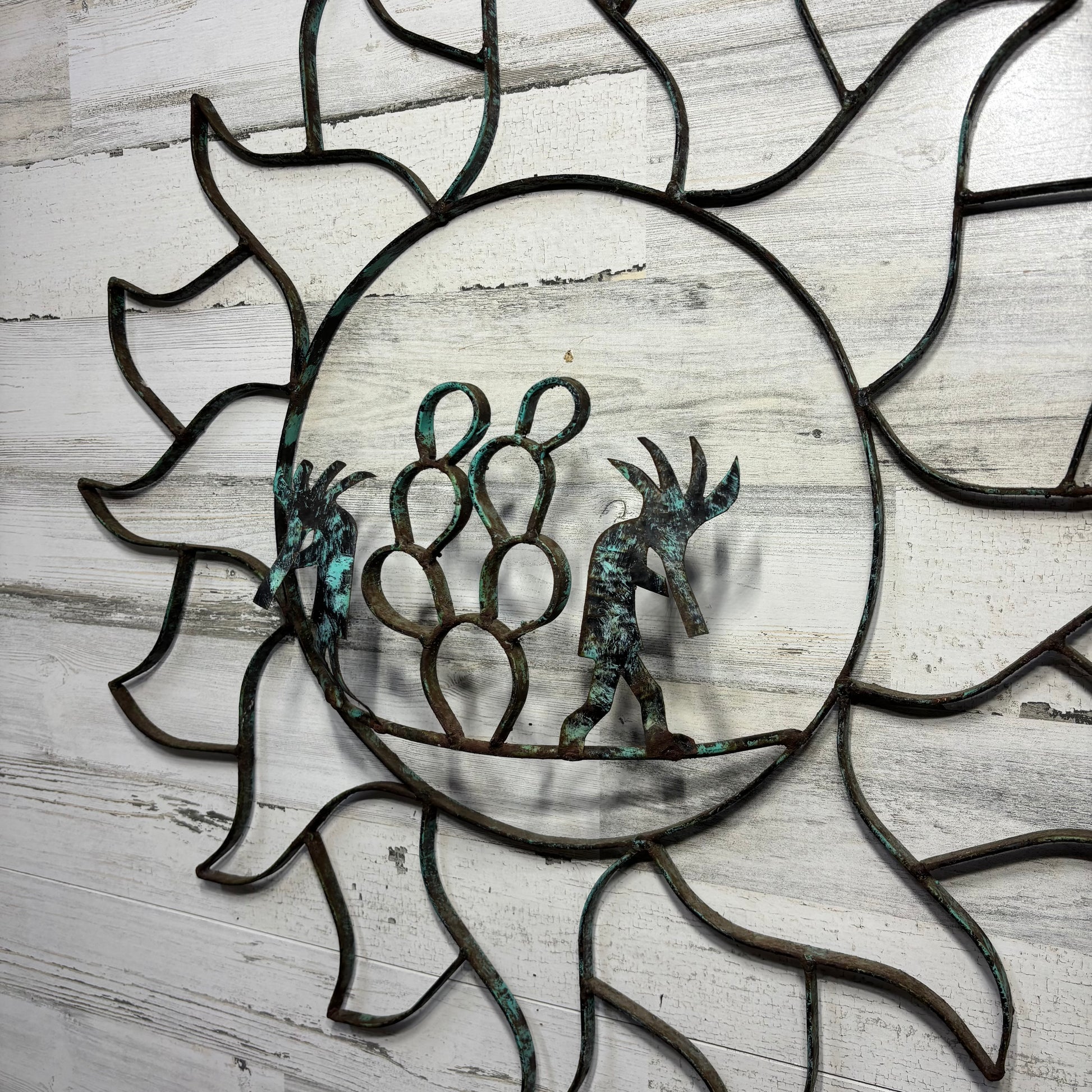 Vintage Sun Shaped Patina Metal Kokopelli Outdoor Decor