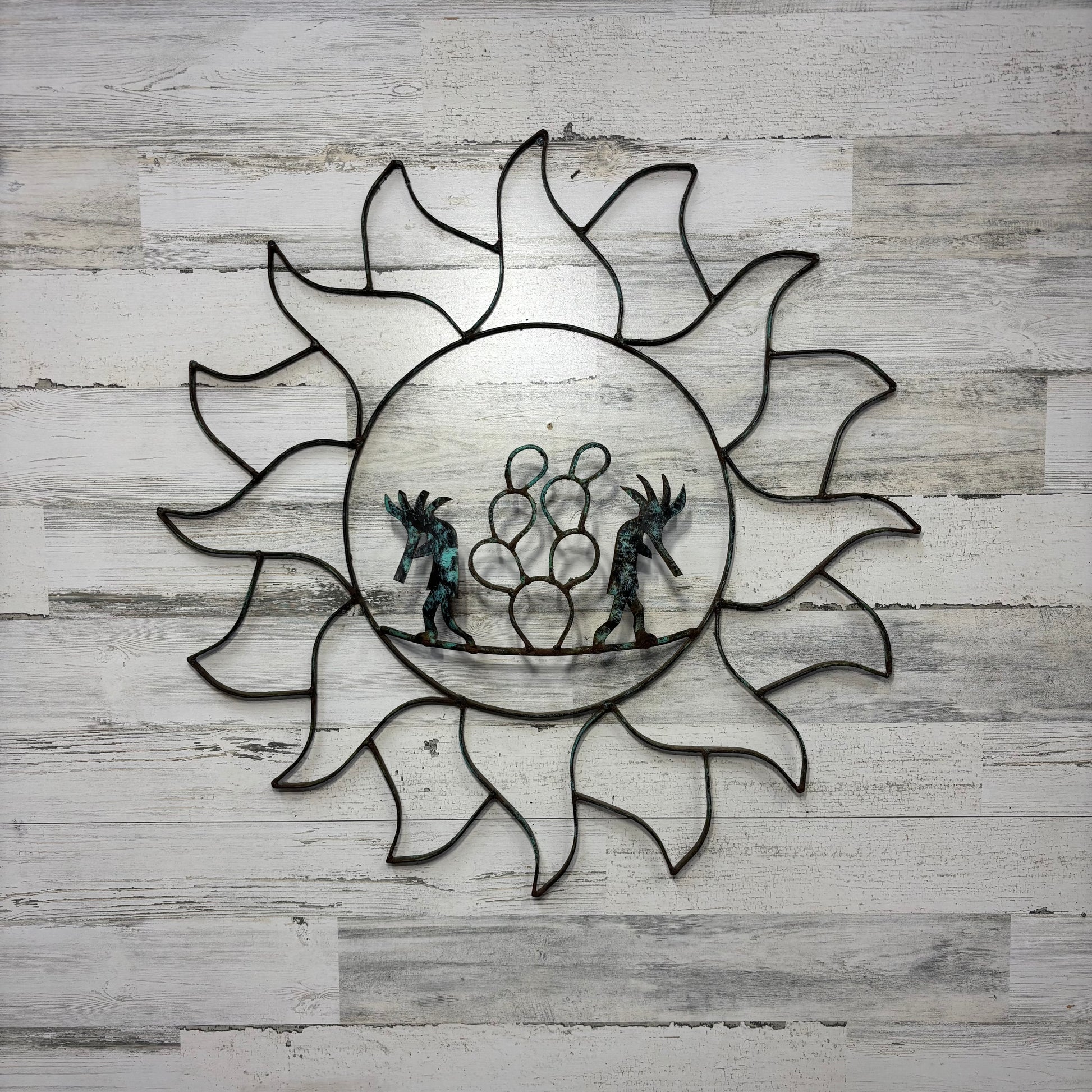 metal wall sculpture with a green patina finish, large sun shape with Kokopelli Figurines and a cactus detailing, hang indoor or outdoor, 27” long, 27” wide, 3.5” deep