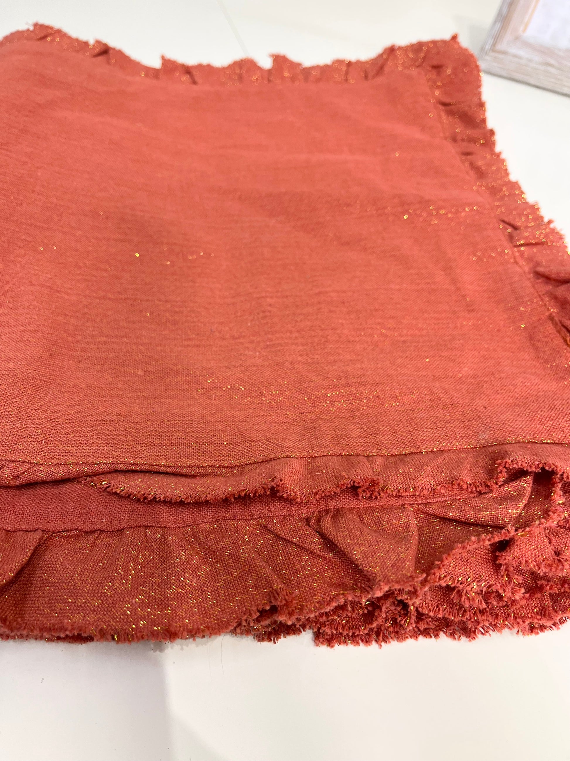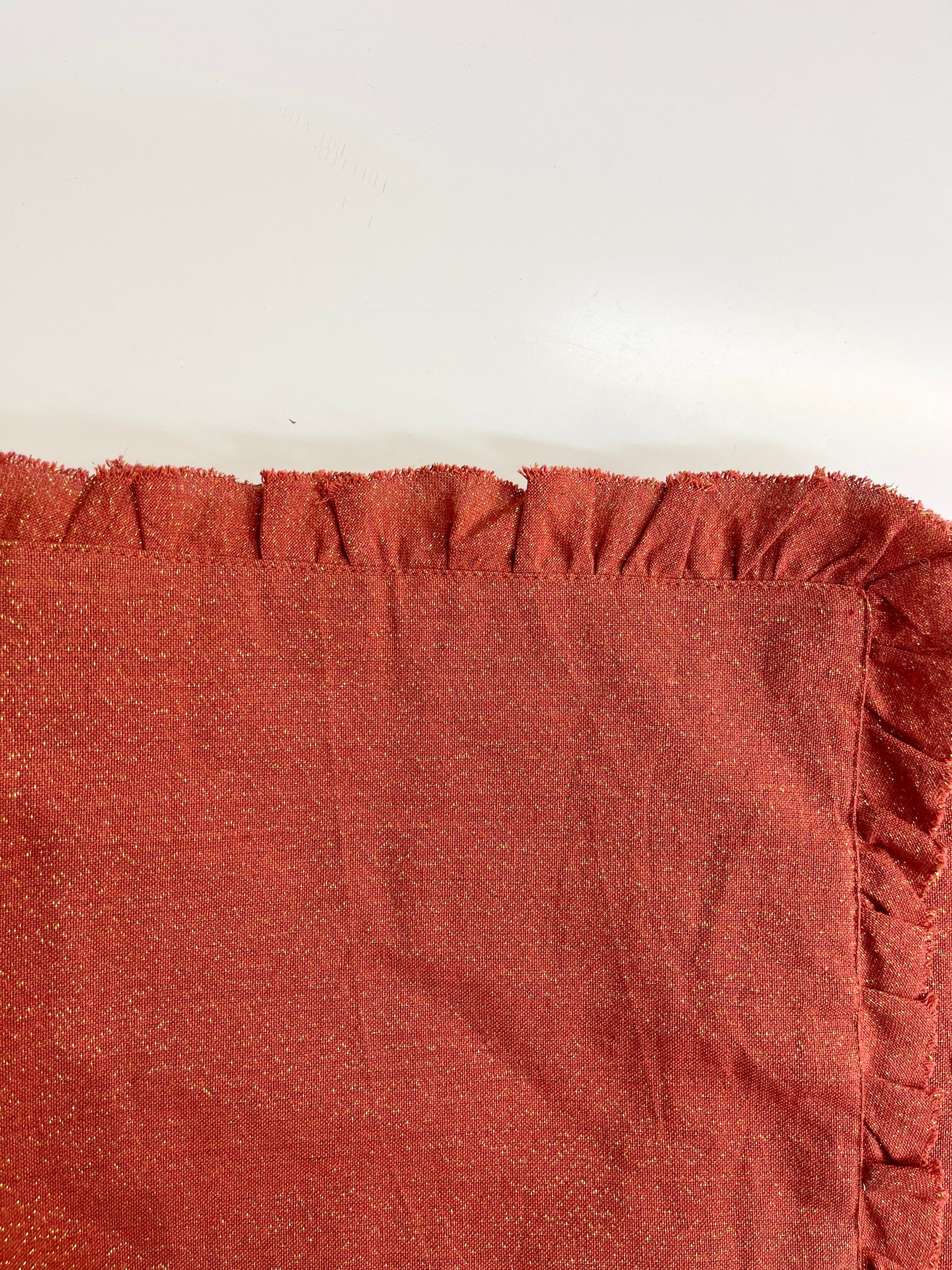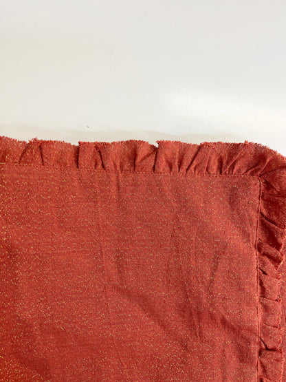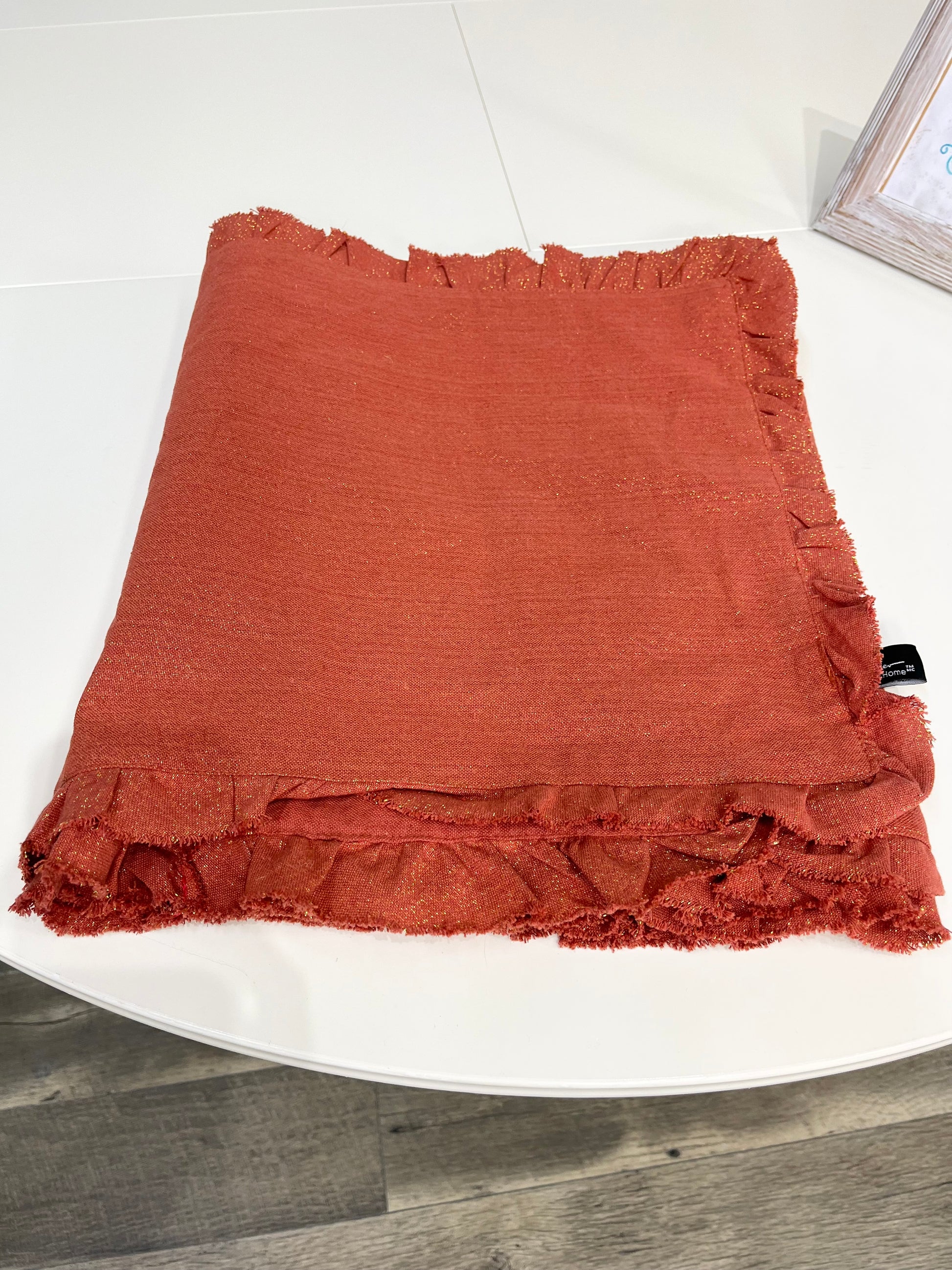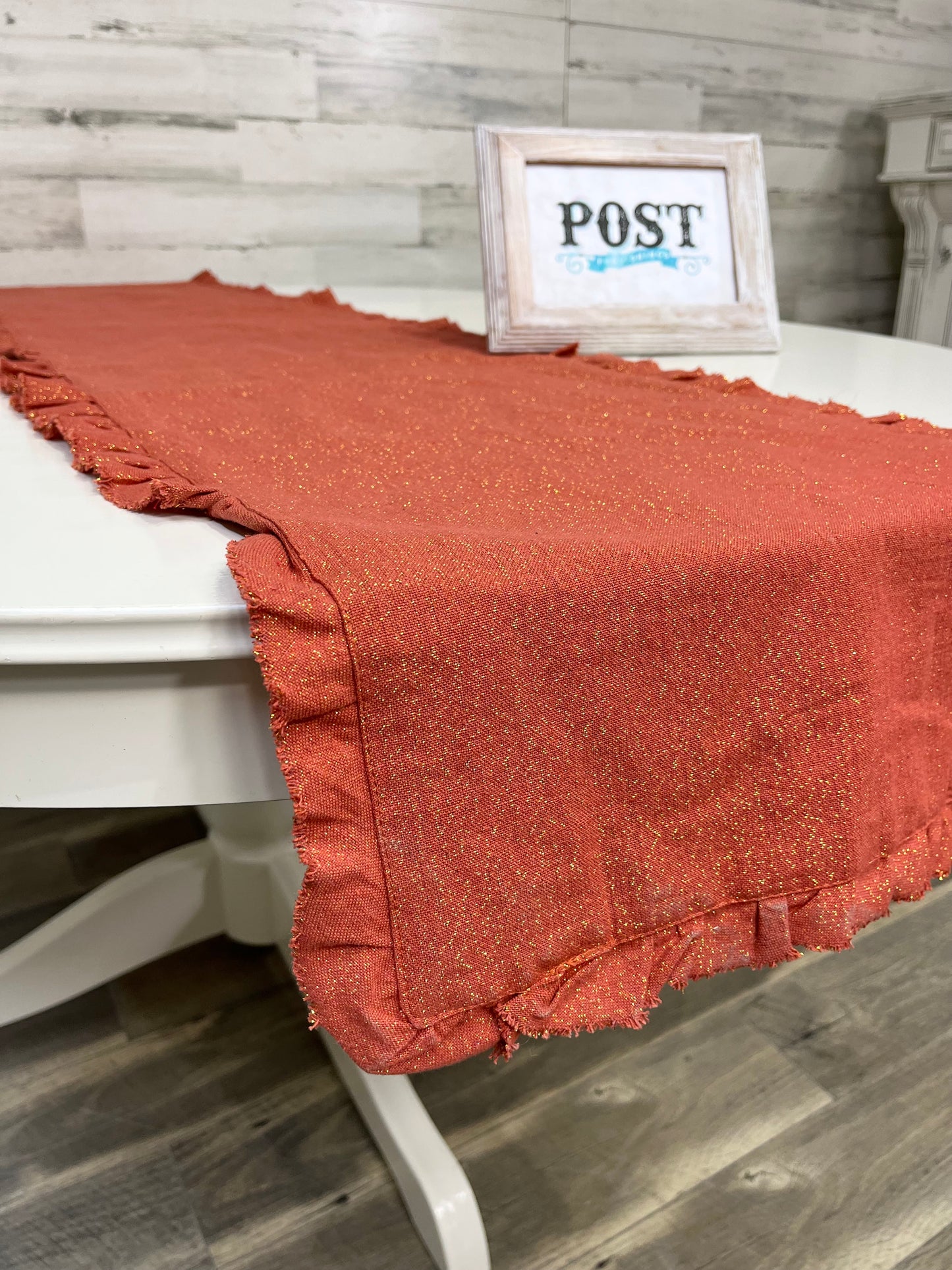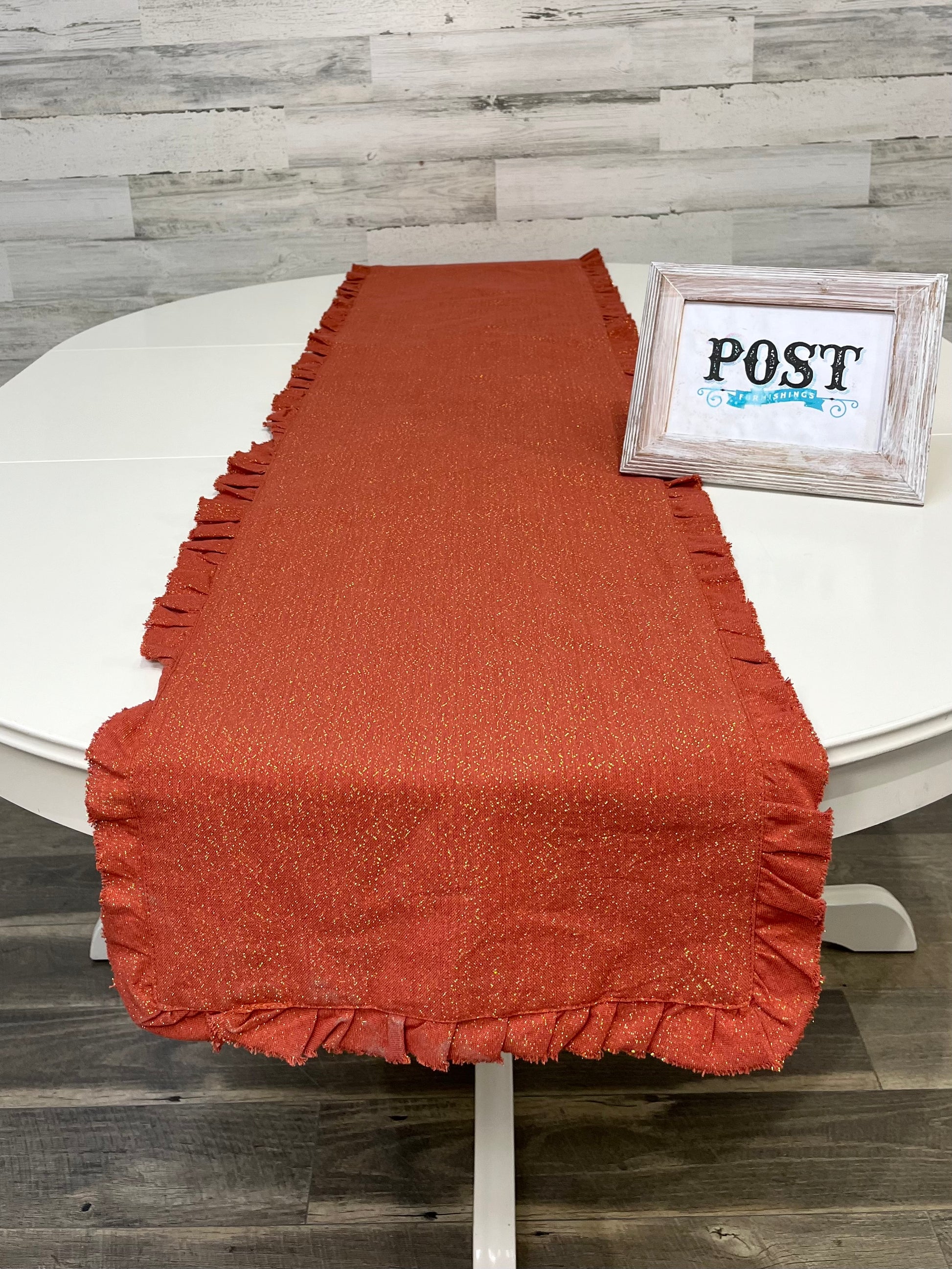 Made by the brand Nicole Miller, a beautiful orange color with gold sparkling details, the edge has a ruffle detailing, perfect time for a thanksgiving dinner decor, it is 86” long, 16” wide