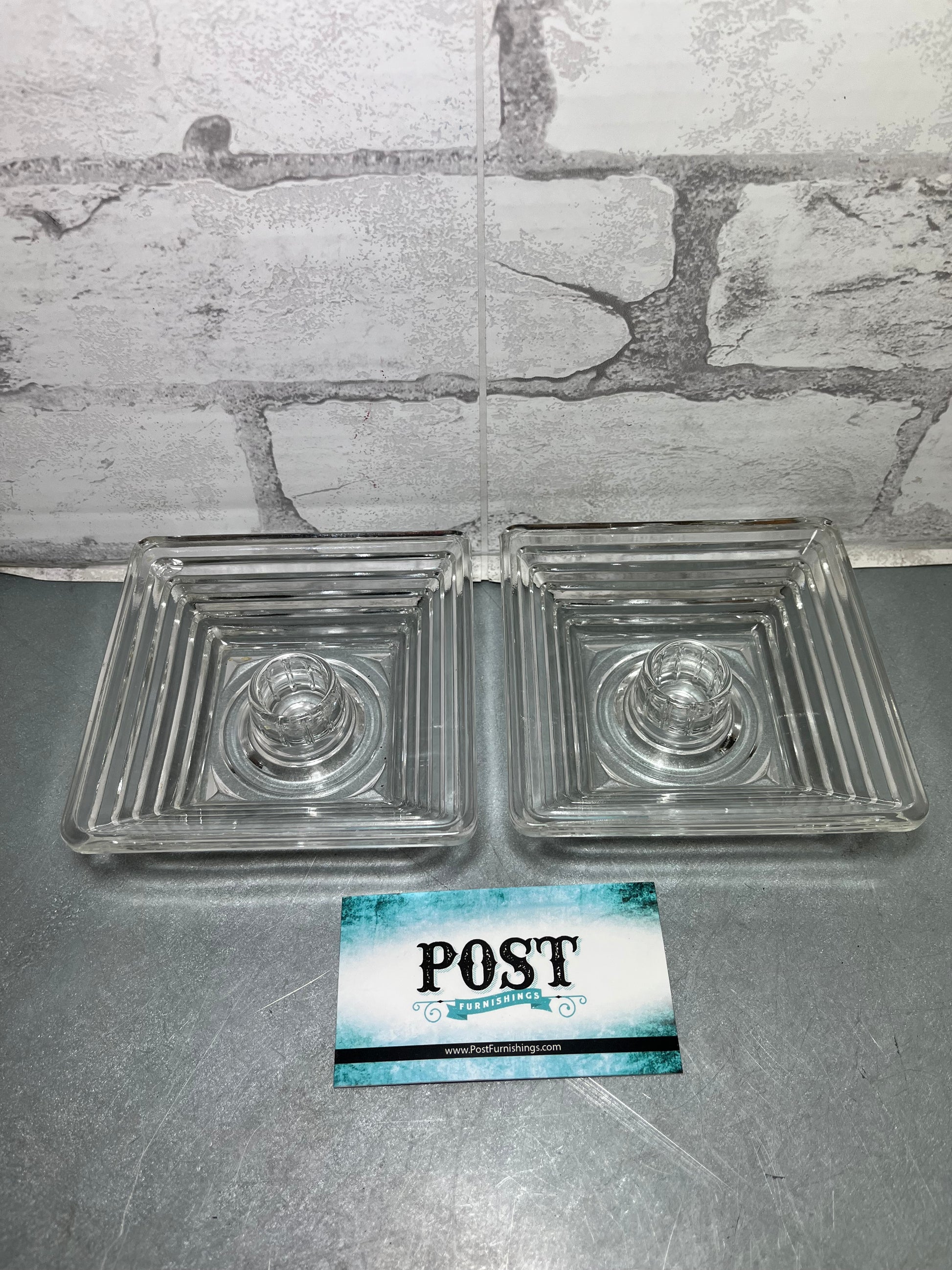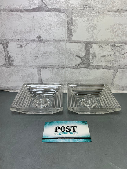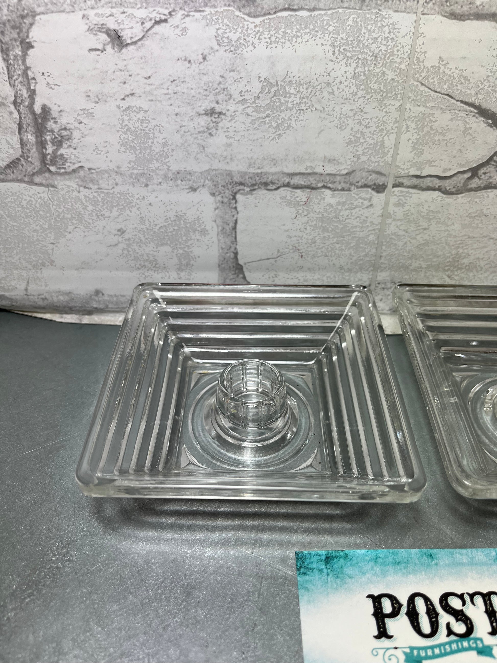 Set of two crystal Anchor Hawking vintage candle stick holders, can be used as a trinket tray, all glass, square shaped, they are 4.5” by 4.5”