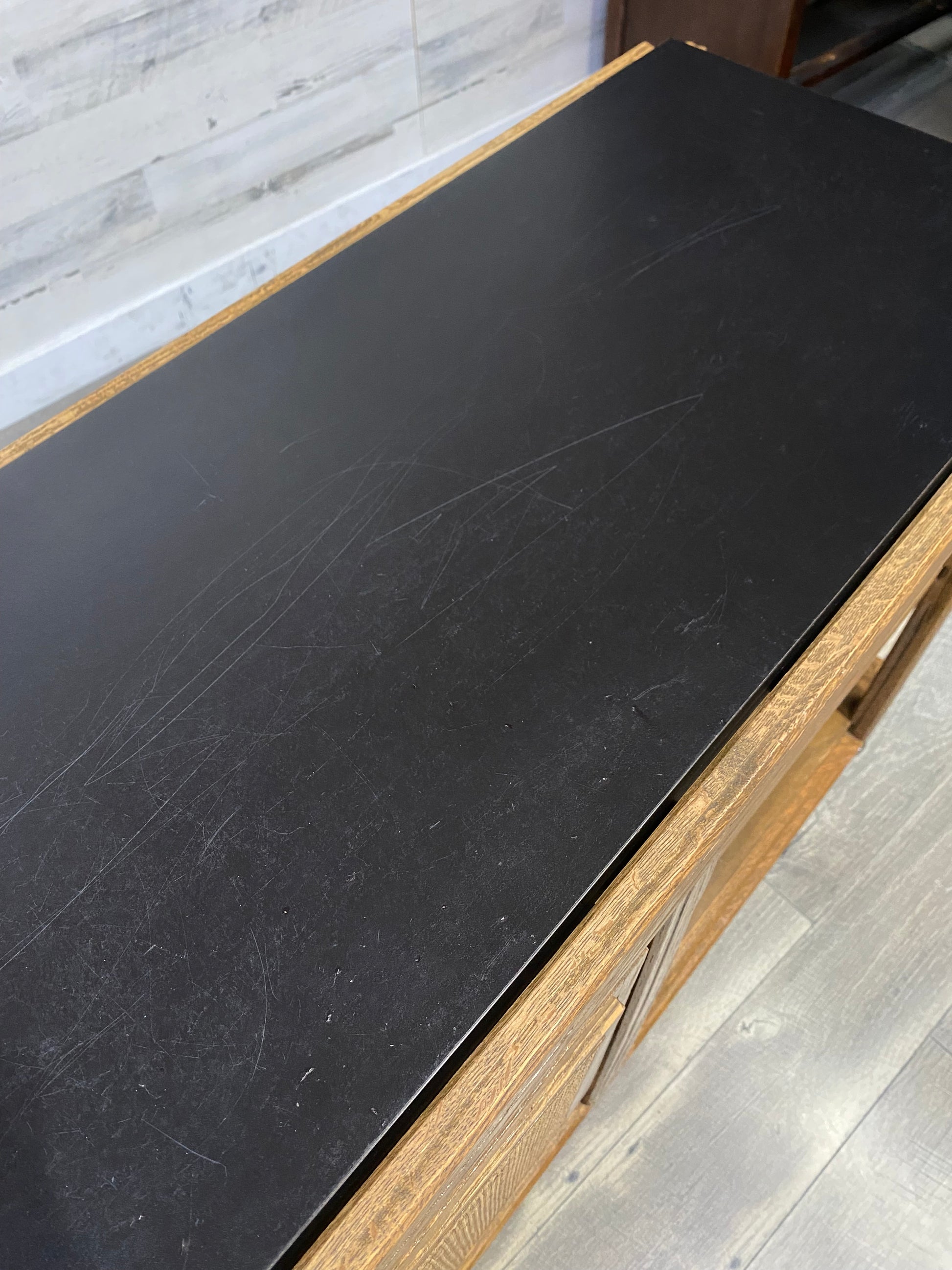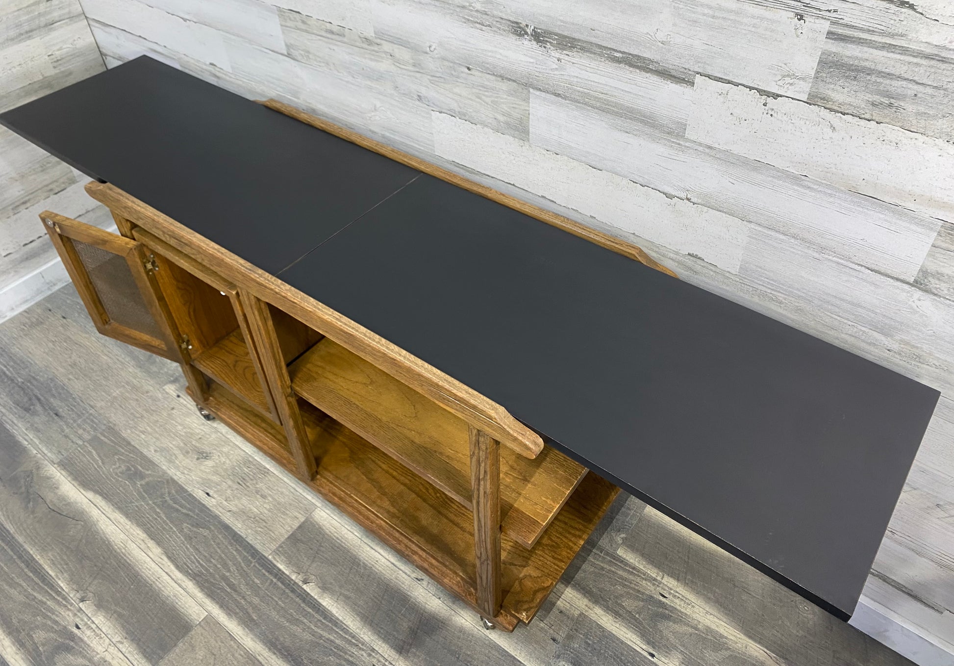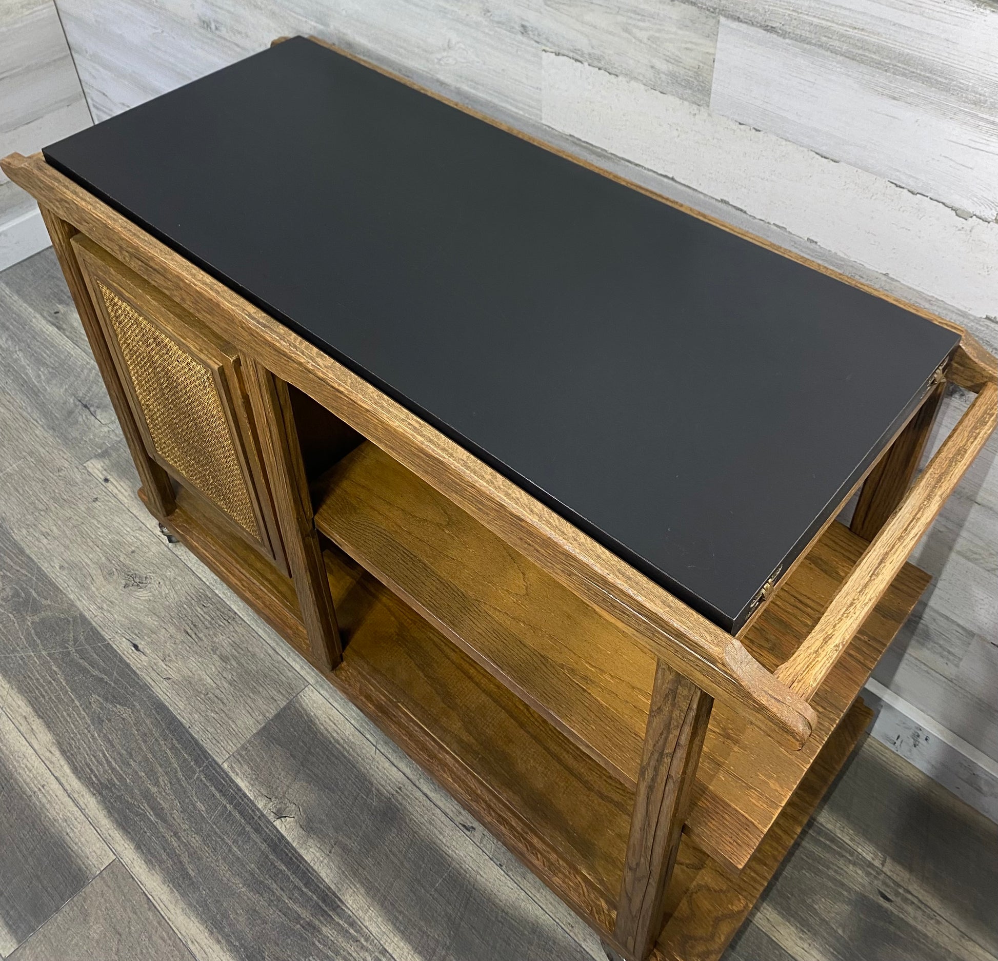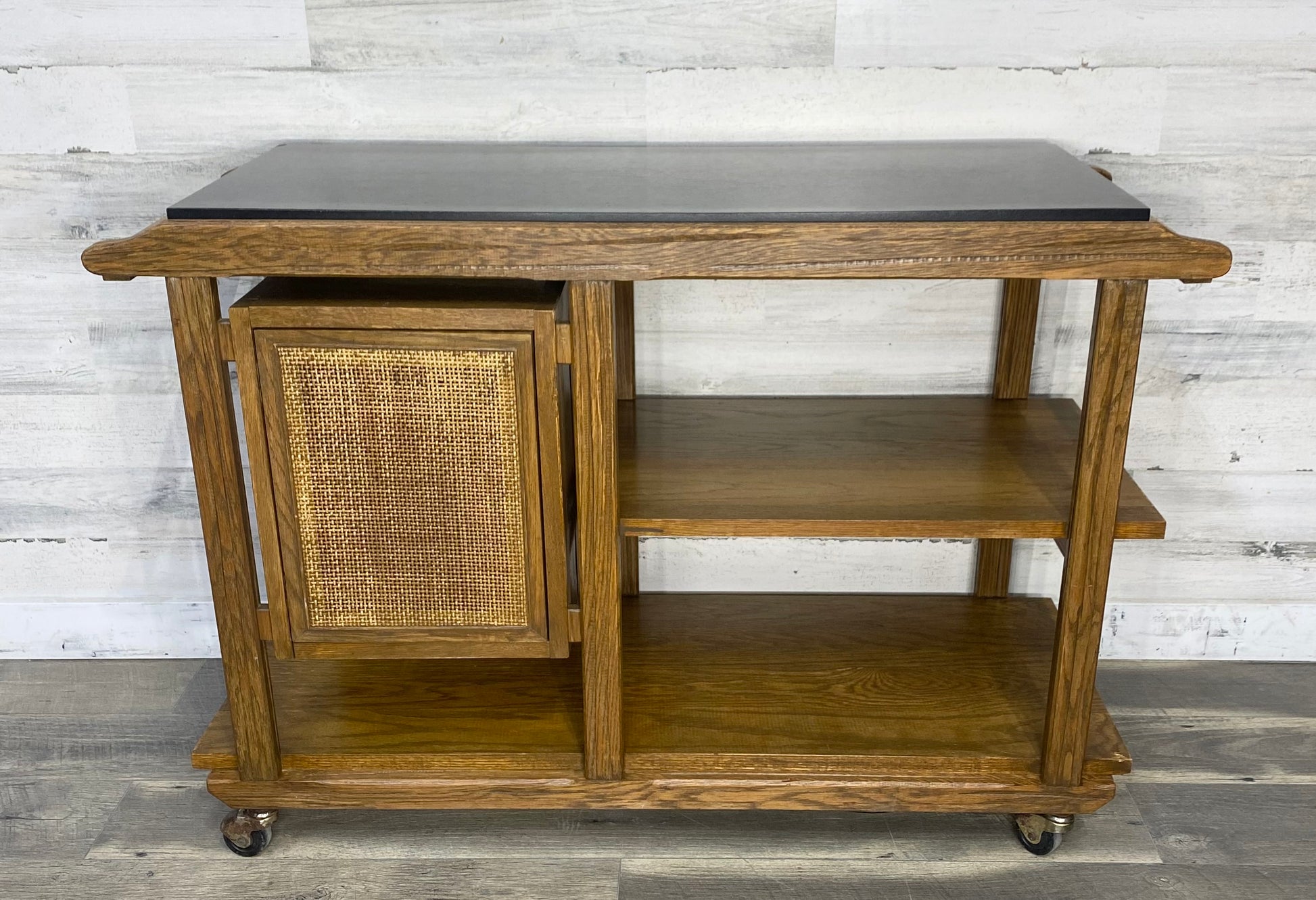 Vintage Brandt Ranch Oak Bar Cart Server. 1960’s very unique piece of furniture. This server is a flip top mica that doubles the serving area. Cane push front door. Built with classic ranch oak. Brass wheels. Mica top shows some scratches.