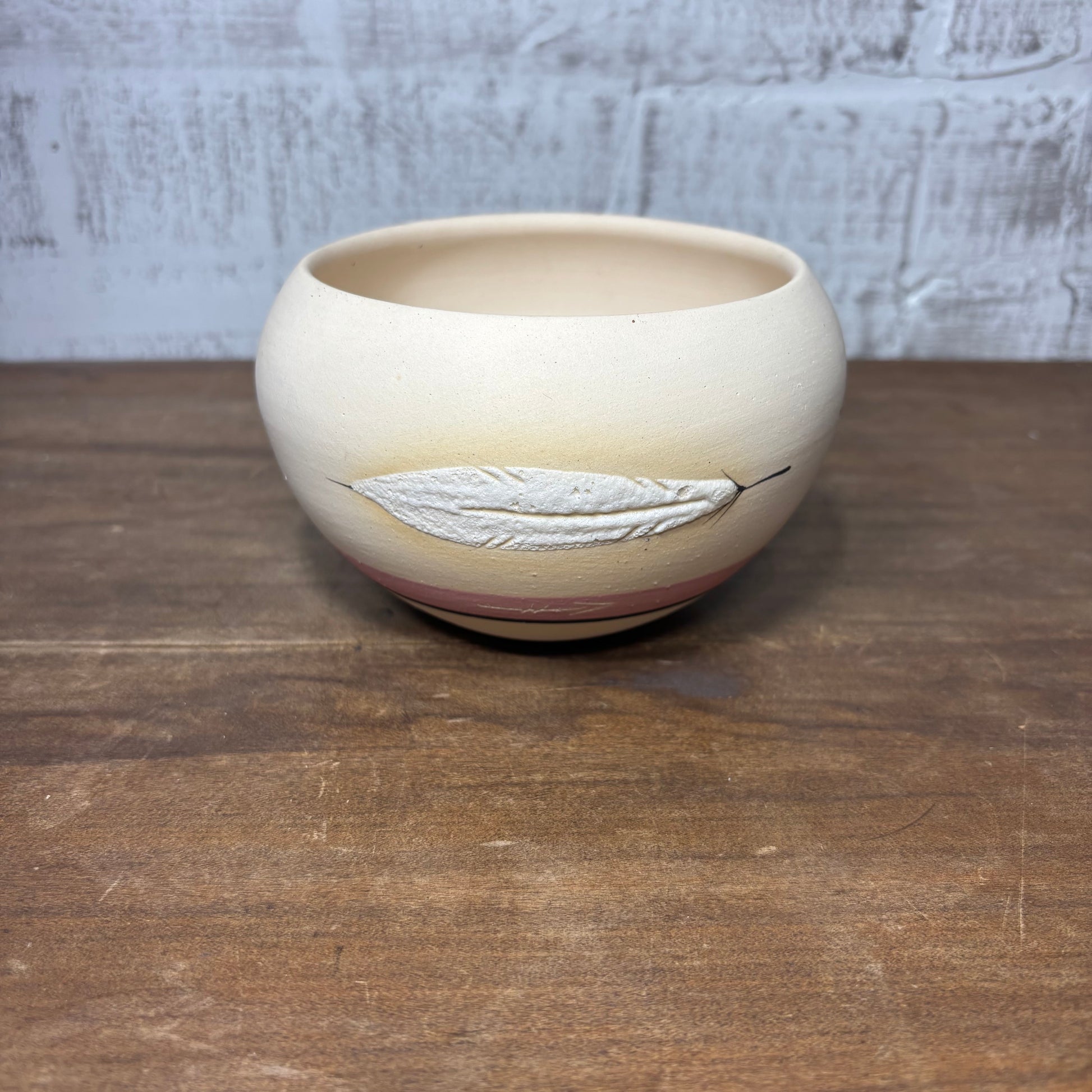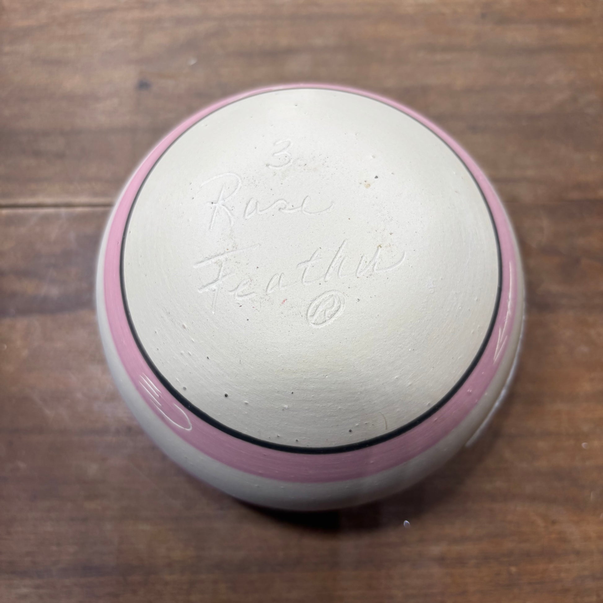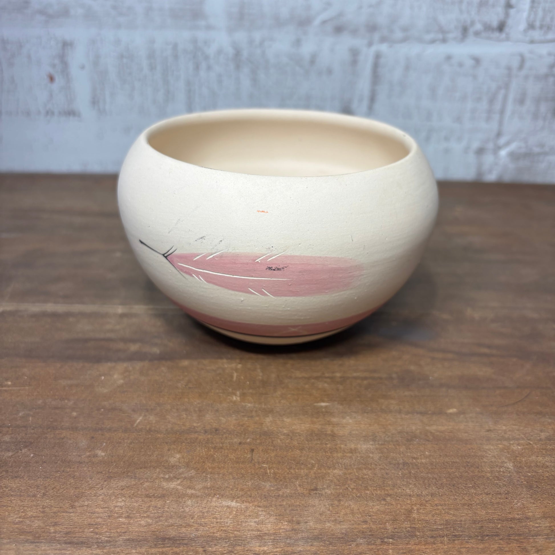 1980s vintage Desert Pueblo Pottery Navajo bowl, signed rose feather #3, 3” deep, 4” diameter opening