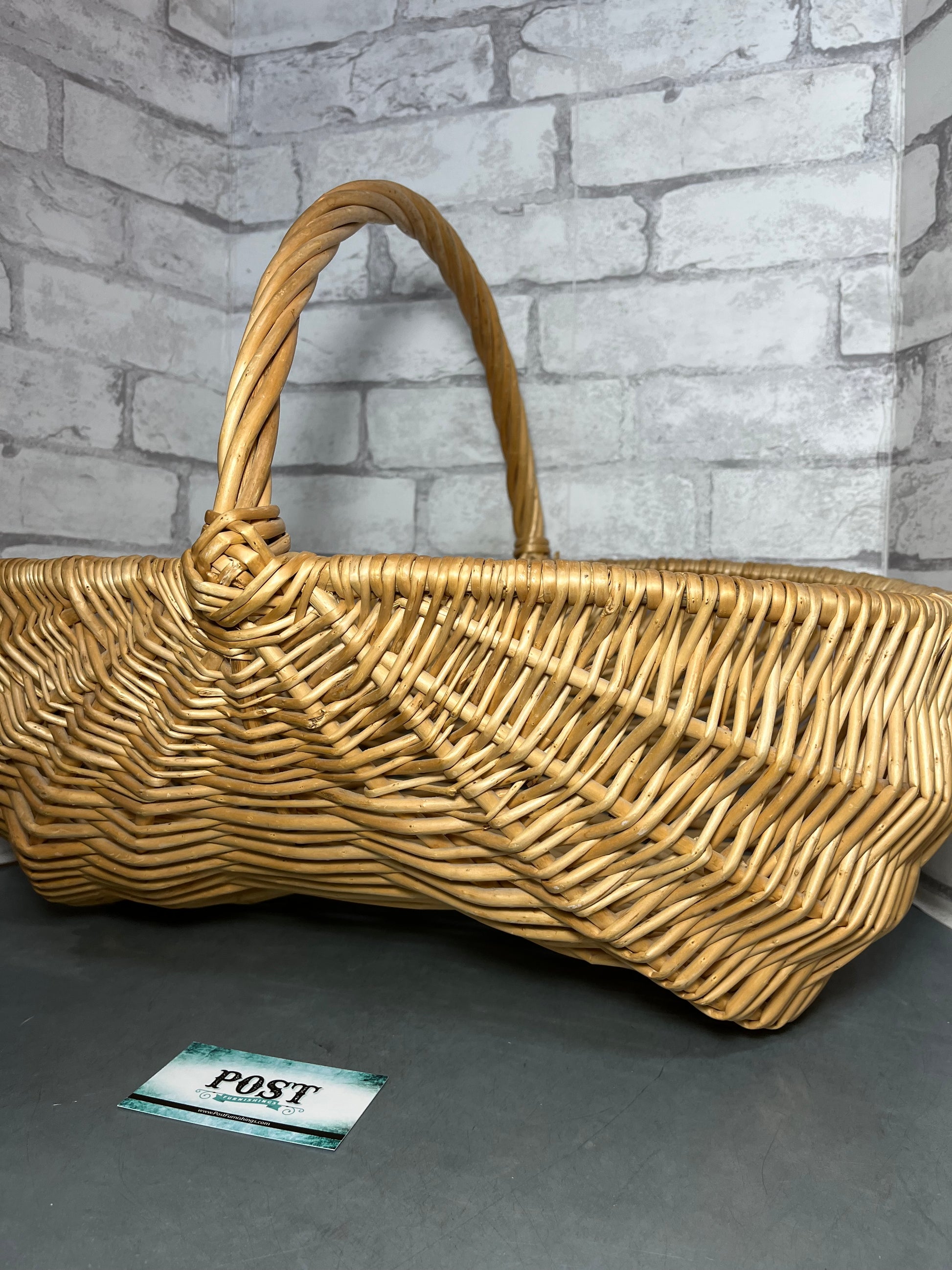 Woven from a lovely blonde wicker, it has a lovely twisted handle, a beautiful buttocks basket shape and just the right bit of distressing to give it charm, This basket is in beautiful vintage condition, It is structurally very sound and well made, it is 21” long, 8” deep, 13” wide,