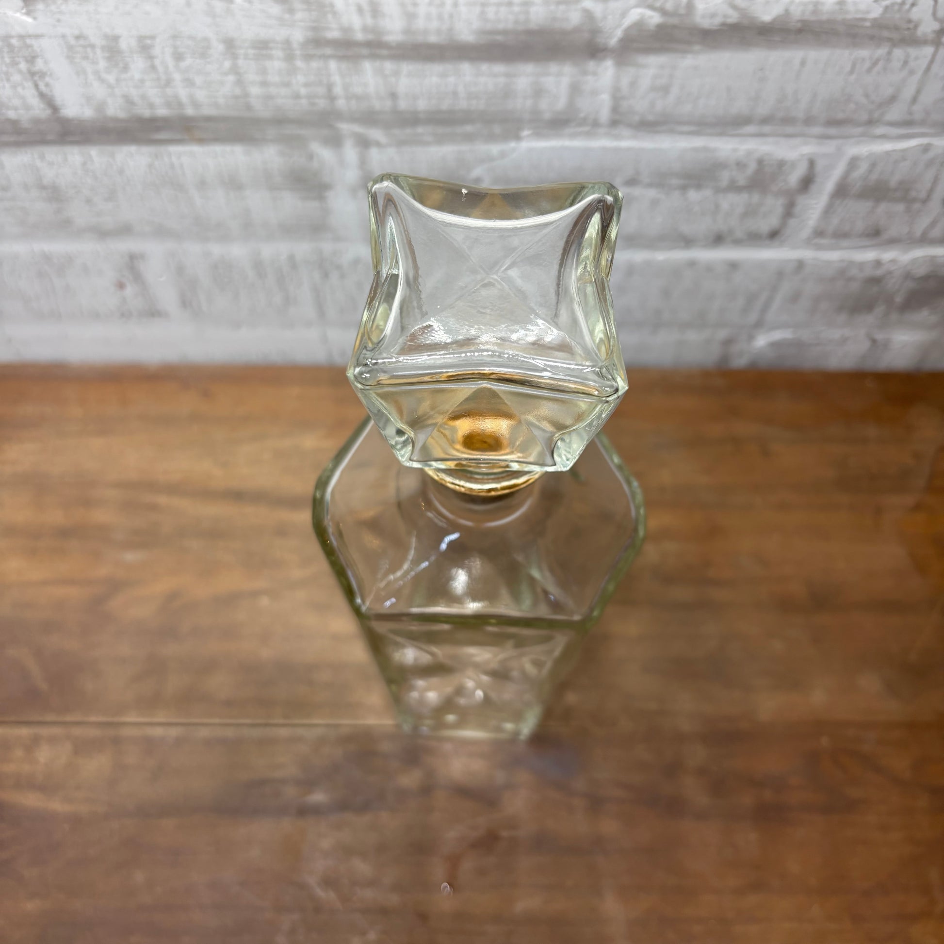Vintage glass decanter bottle with cork glass stopper, no chips or cracks, 12” tall with top, 4” wide