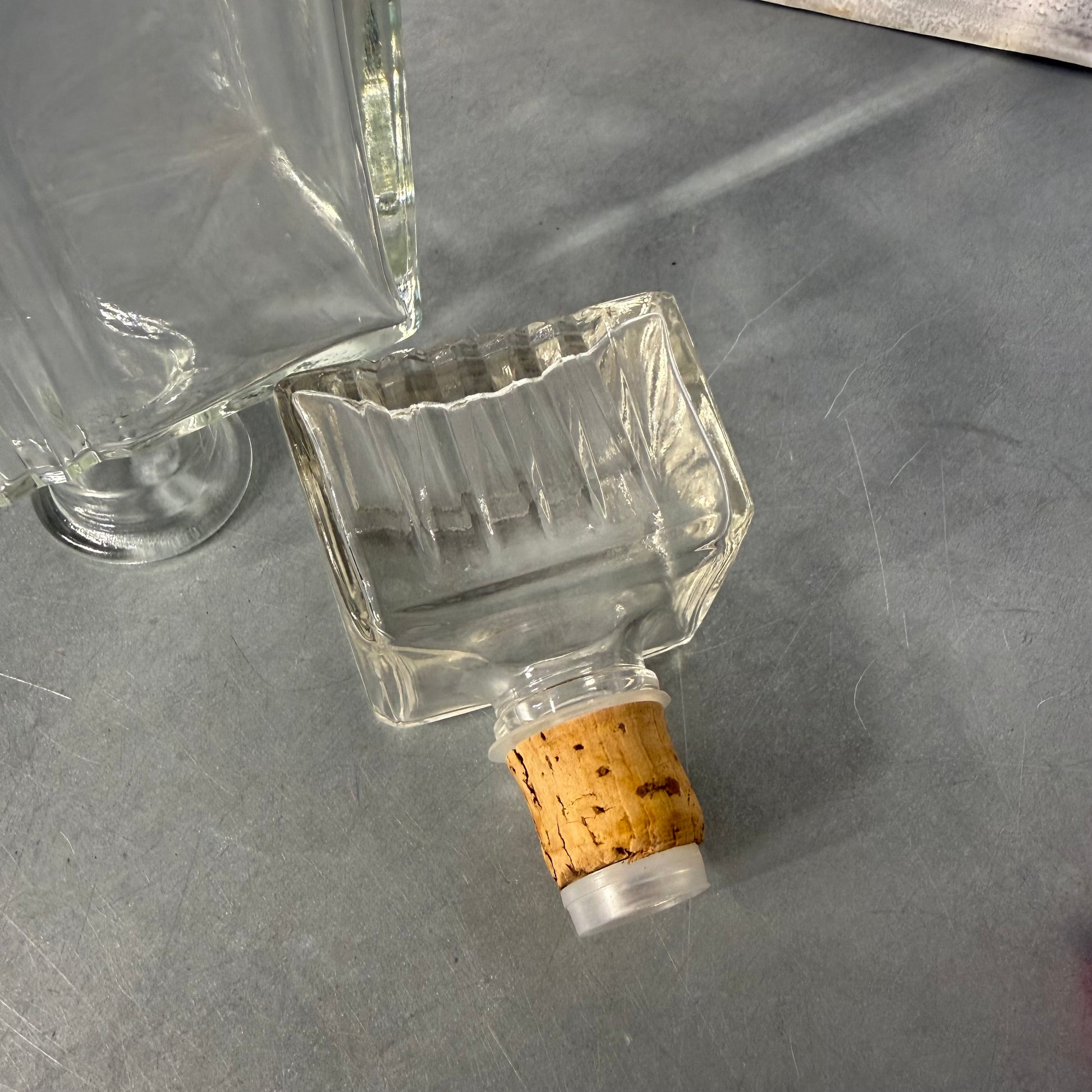 Clear vintage glass decanter bottle with stopper. No chips or cracks. 11” x 4” x 2”