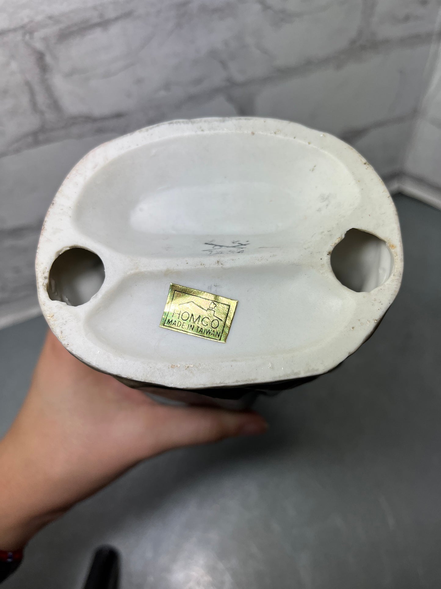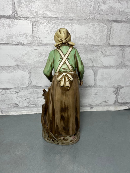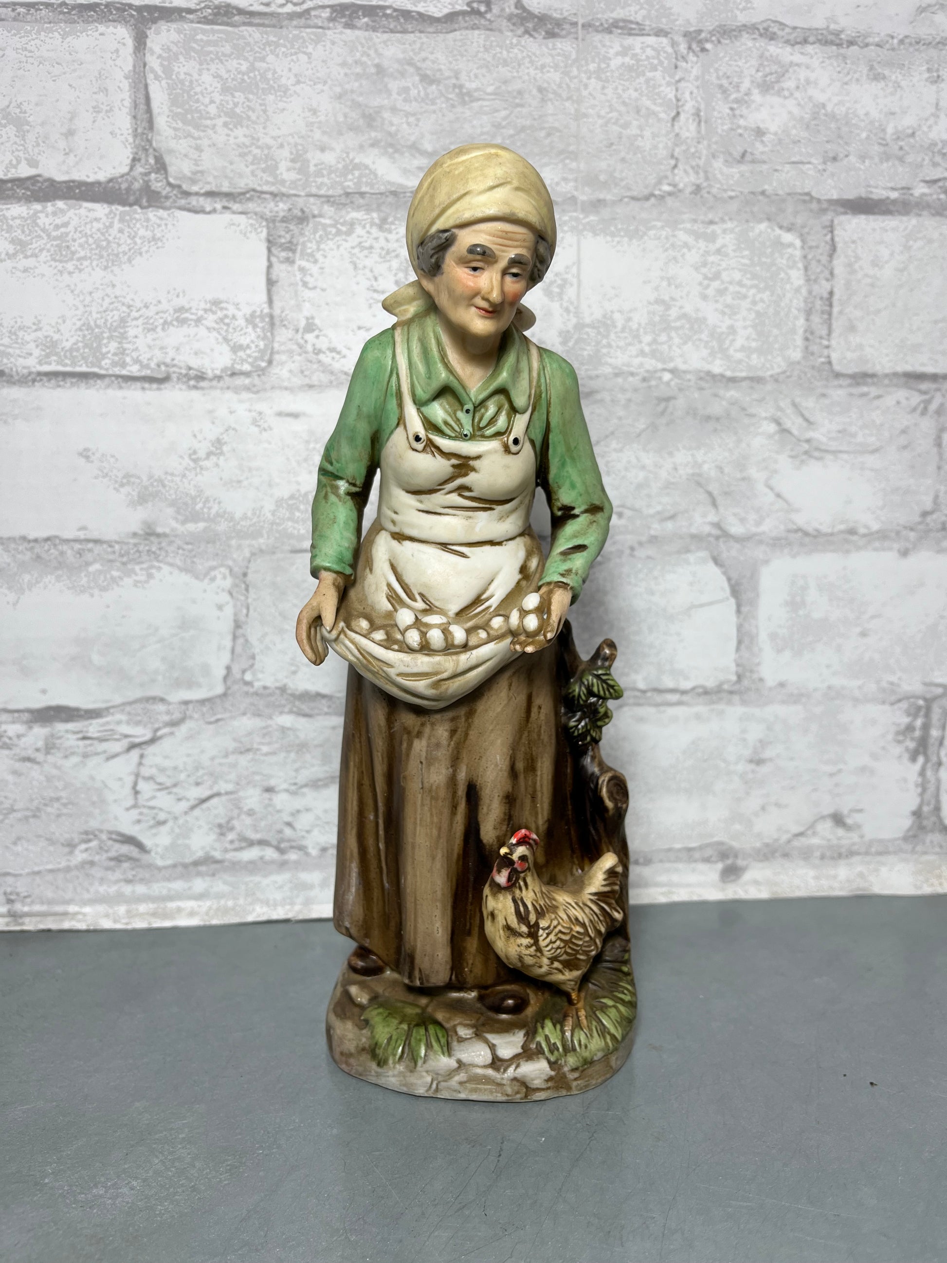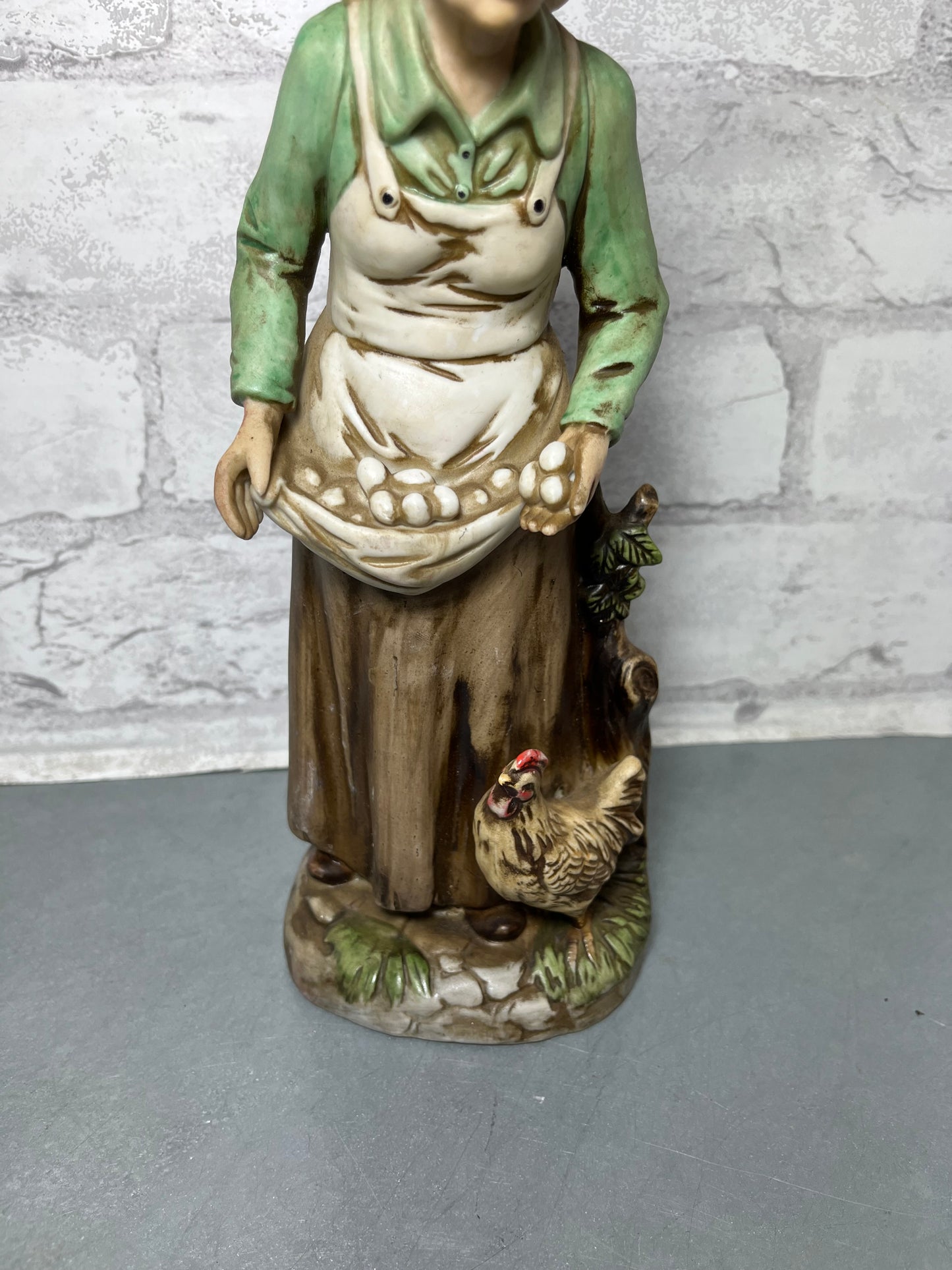 Made of porcelain, this is a vintage Homco Figurine, it’s a lady collecting eggs and a rooster, it is 10” tall, 4” wide