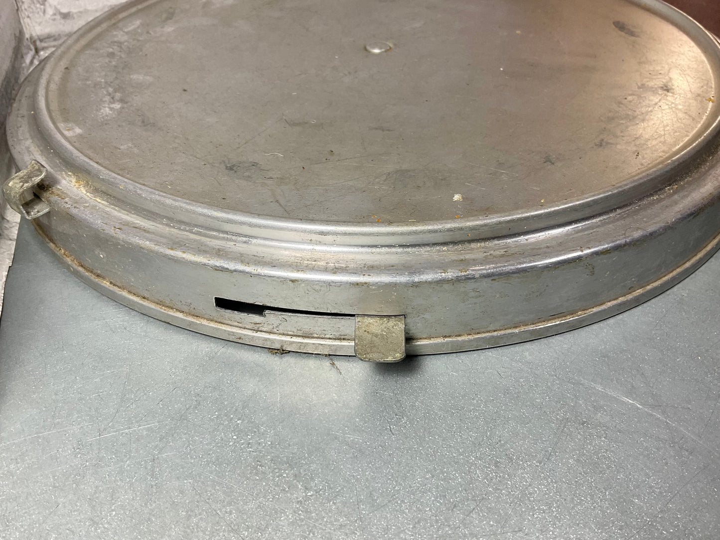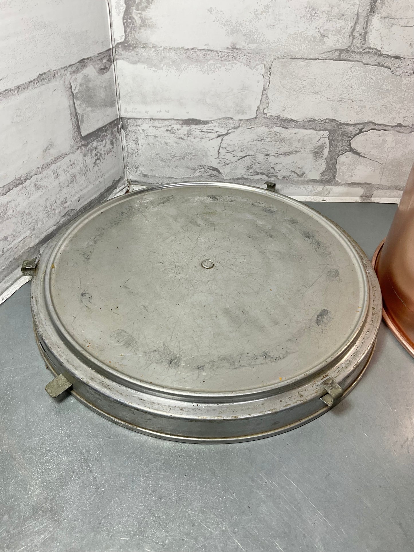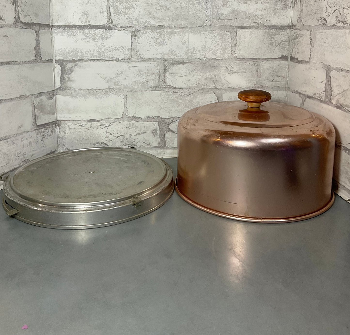 Vintage Mirro Aluminum Copper colored cake platter. Locks with the sliding metal latch’s. The handle is wood. 6’ tall , 10’ wide. There are some dents and scratches, but still very useful!