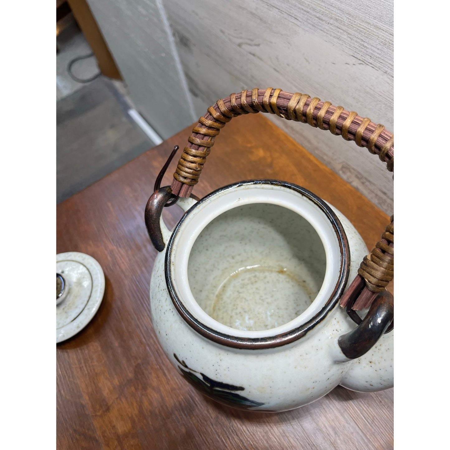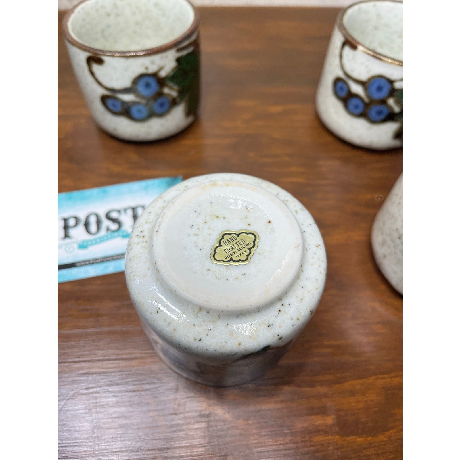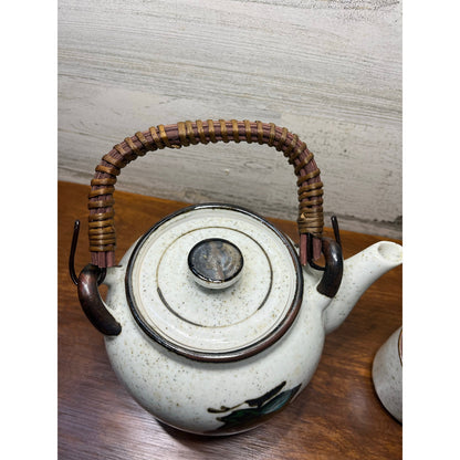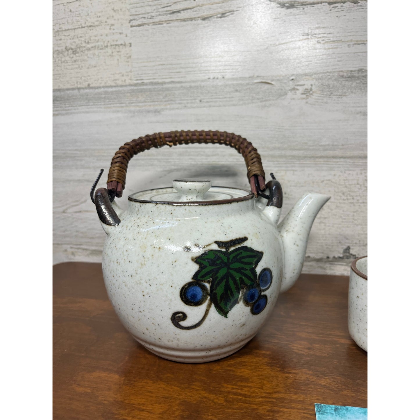 Handcrafted stoneware speckled pottery, with a grapevine design, made in Japan, hand crafted, has a rattan style handle, comes with six cups and one teapot, it is 7.5” wide, 5” tall without handle, cups are 2.5” tall, 2.5 wide