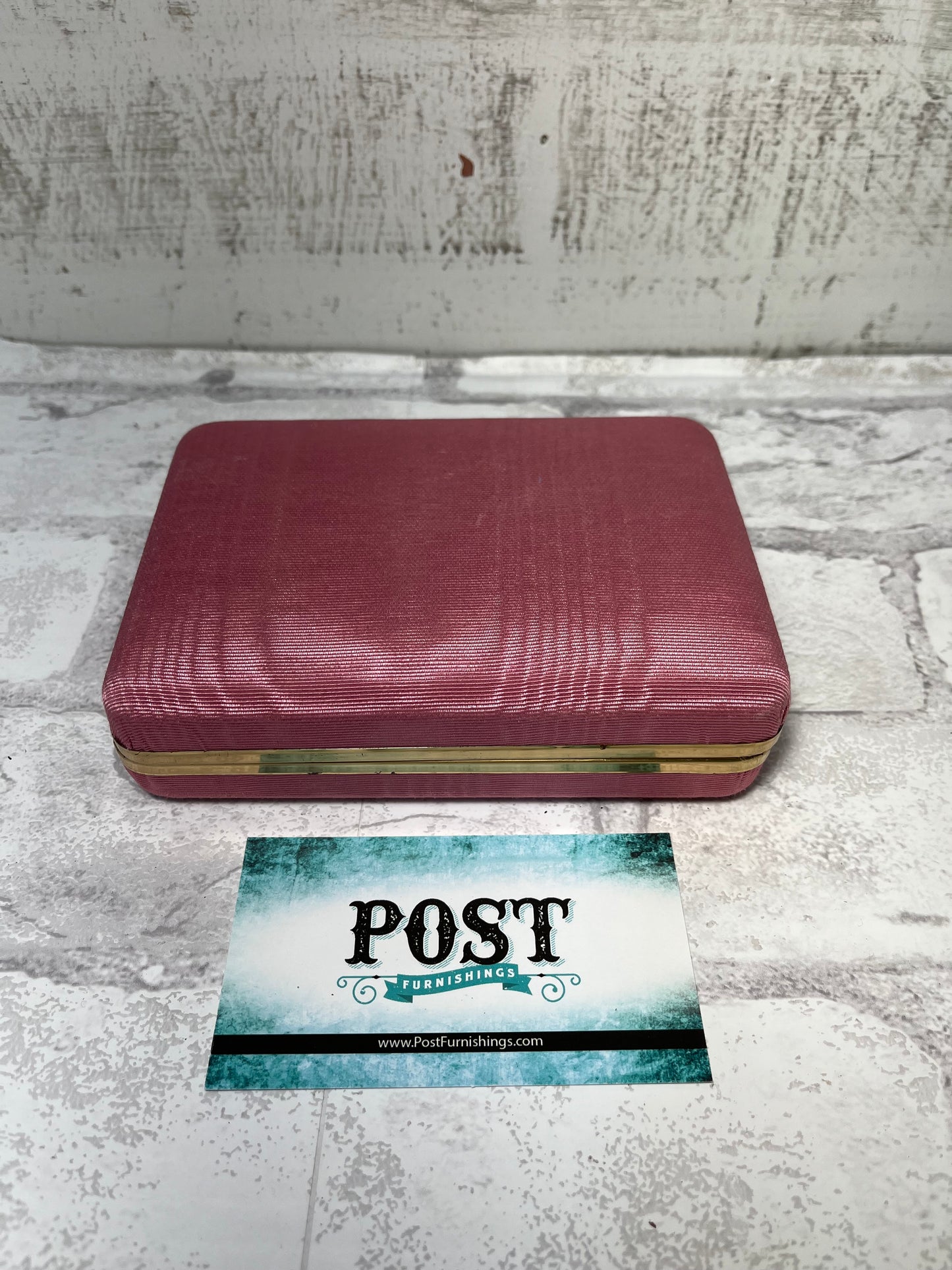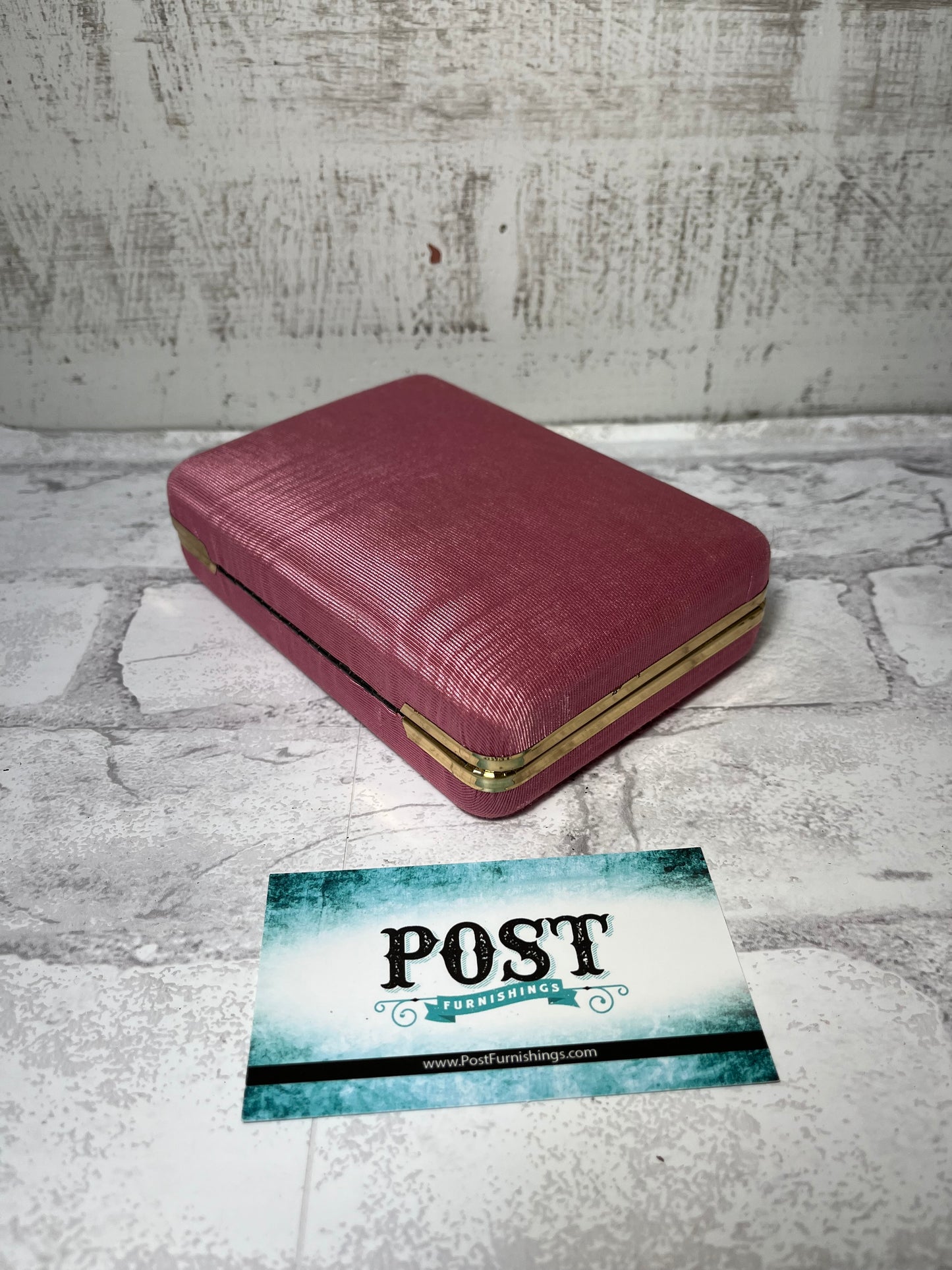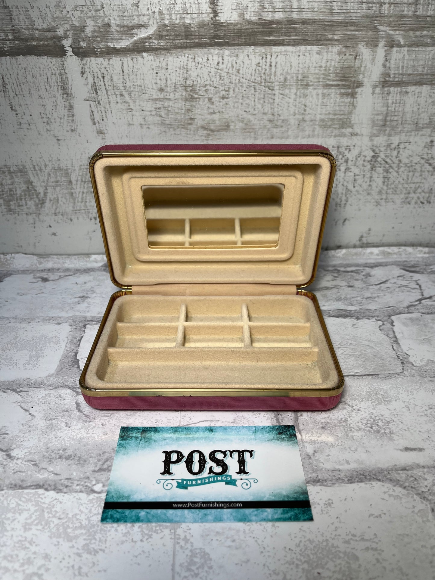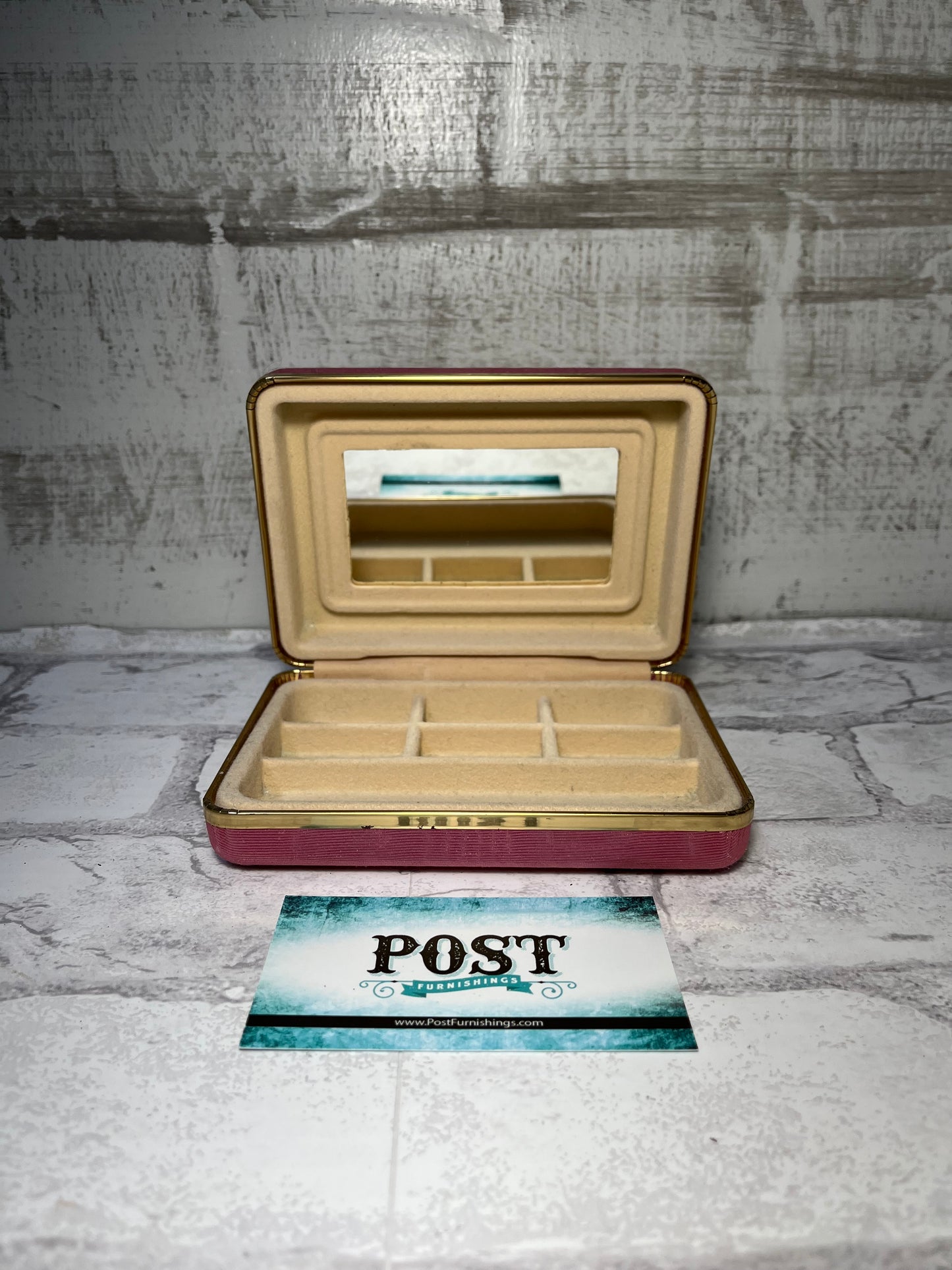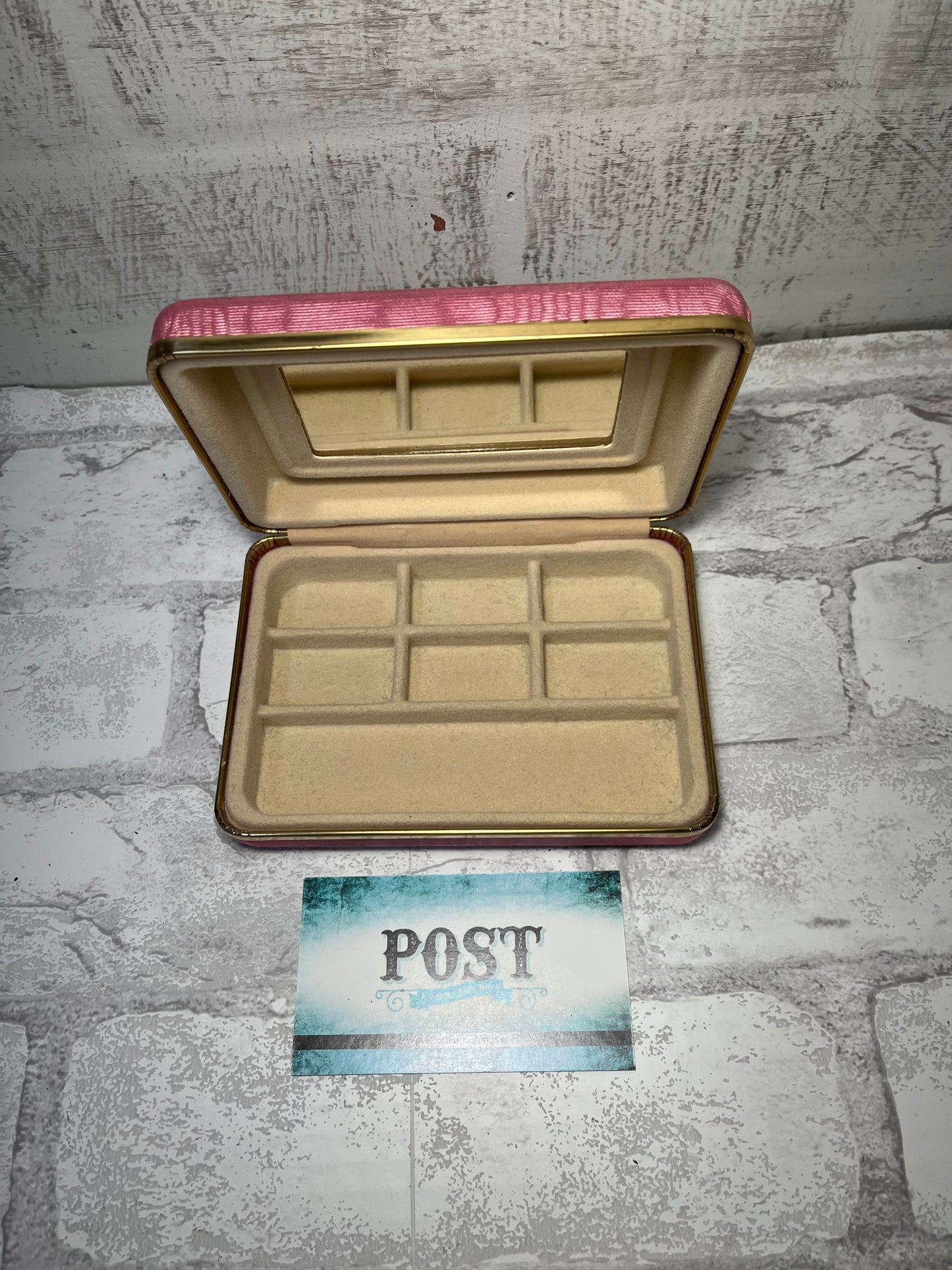 Vintage Small Pink Jewelry Box Case Travel Organizer with Mirror, clamshell opening design, compartments for rings, earrings, bracelet etc., plush pink color, it is 5.5” long, 4” wide, 1.5” tall