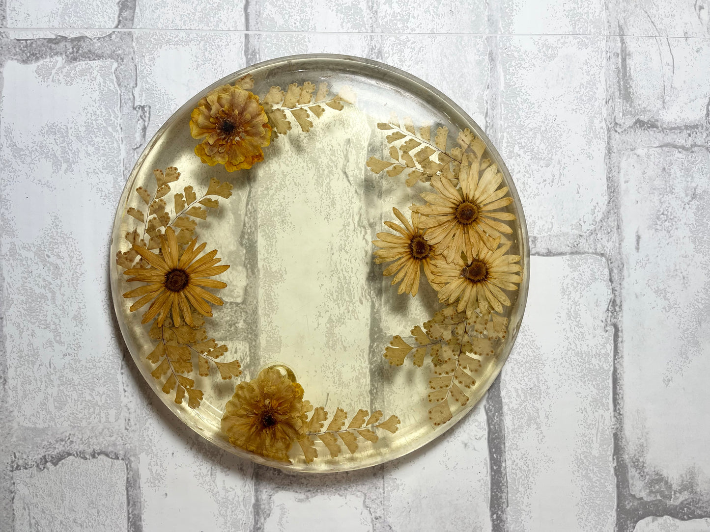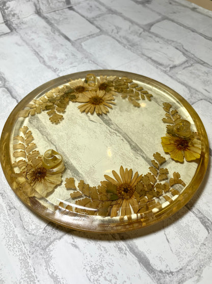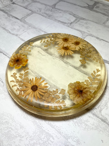 Vintage Resin With Flowers Lucite Trivet, dried flowers inside the resign, circular trivet, can be a tray, beautiful vintage mid century, it is 8” diameter