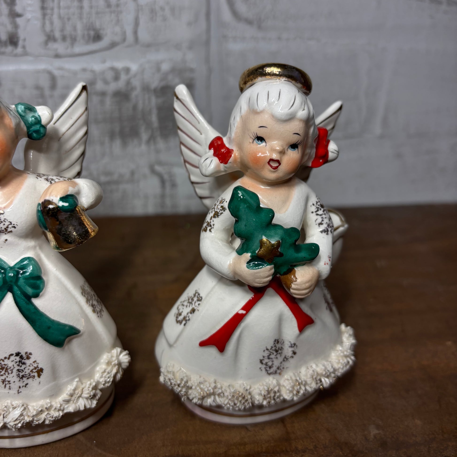 Vintage Ucagco made in Japan porcelain spaghetti trim set of two angels, one with a bell and the other with a Christmas tree, some staining can be seen in photos, 5” tall, 3” wide