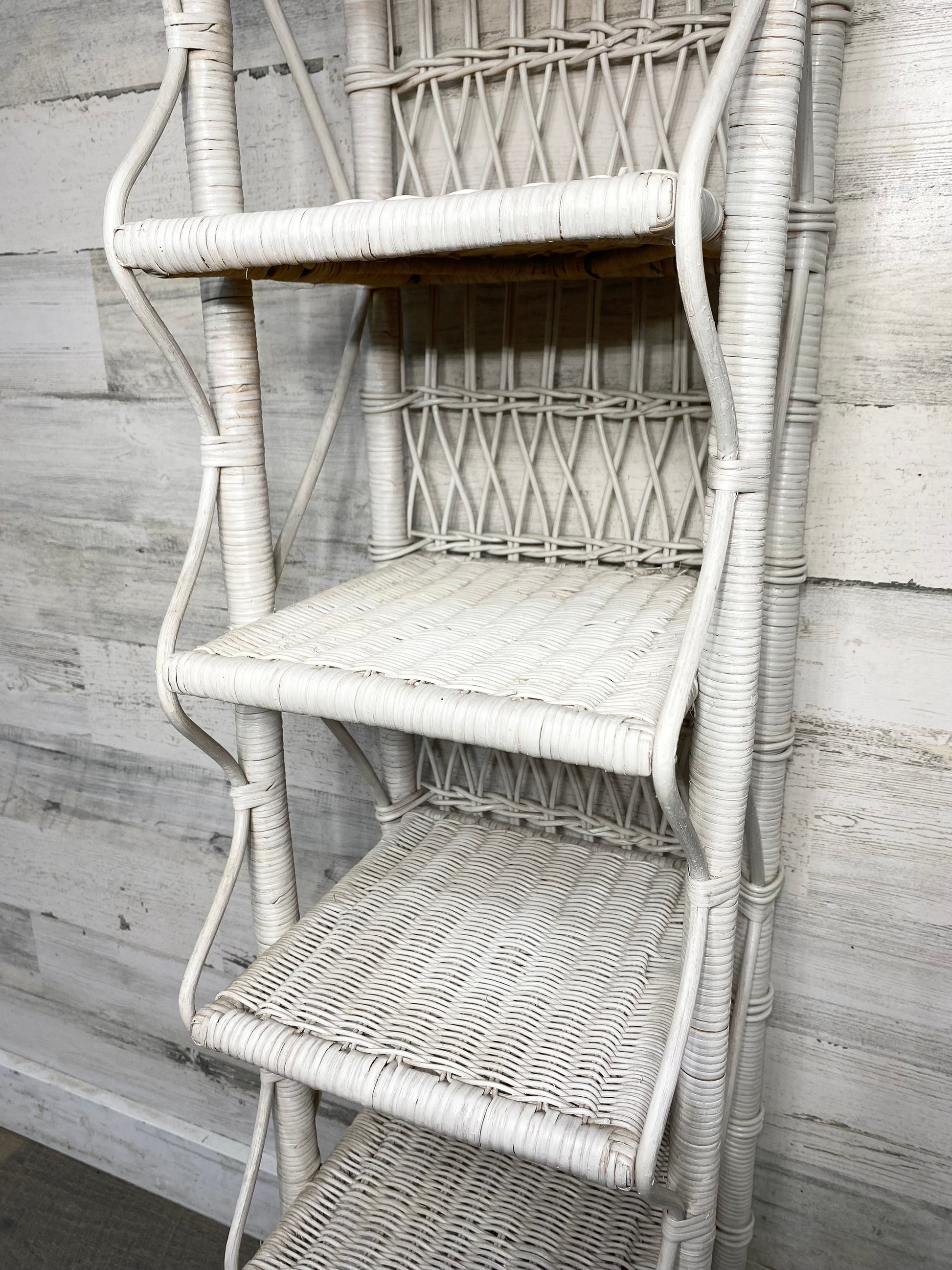 Vintage wicker shelf. Sturdy for its size. Does have a couple spots of whicker damage see pics. White color but can easily be painted!