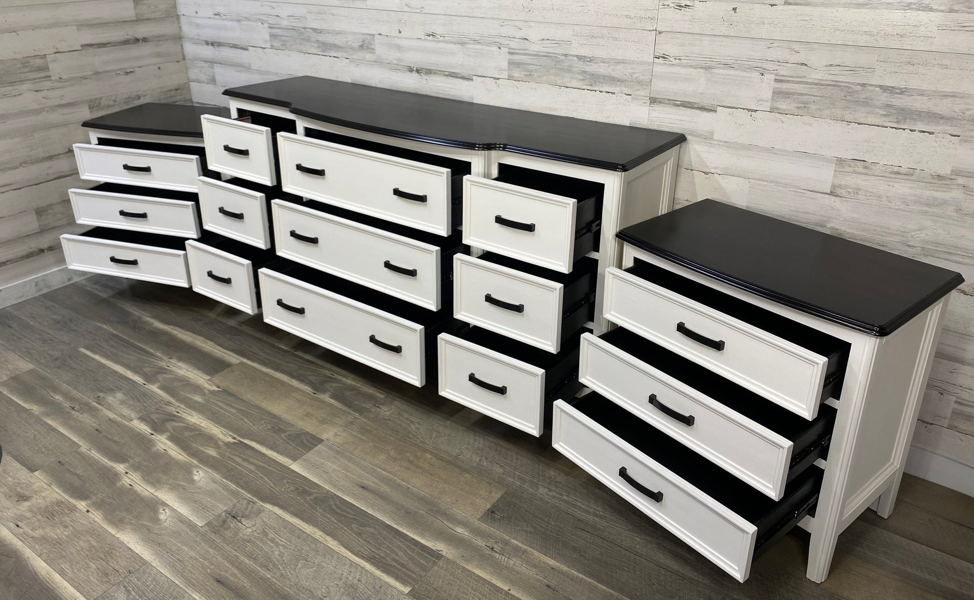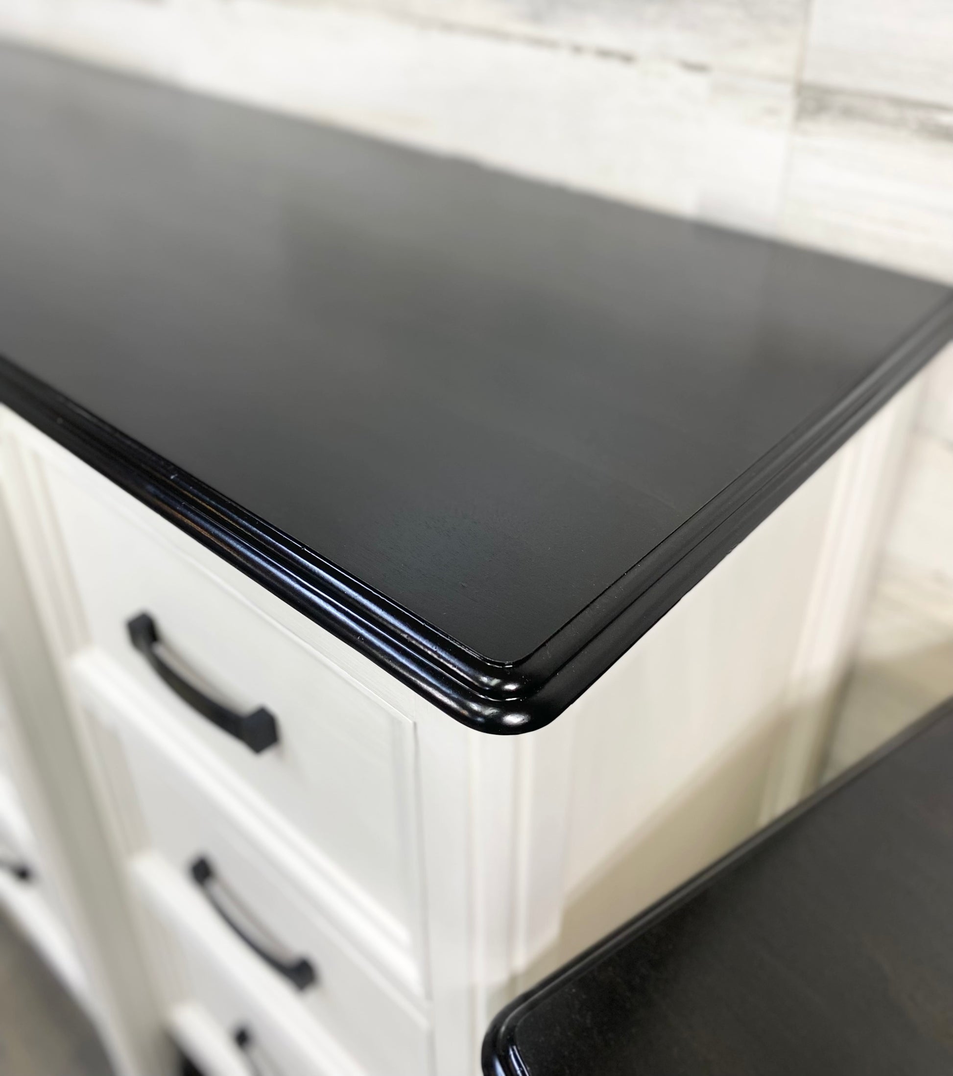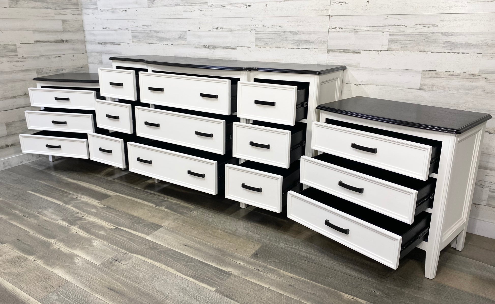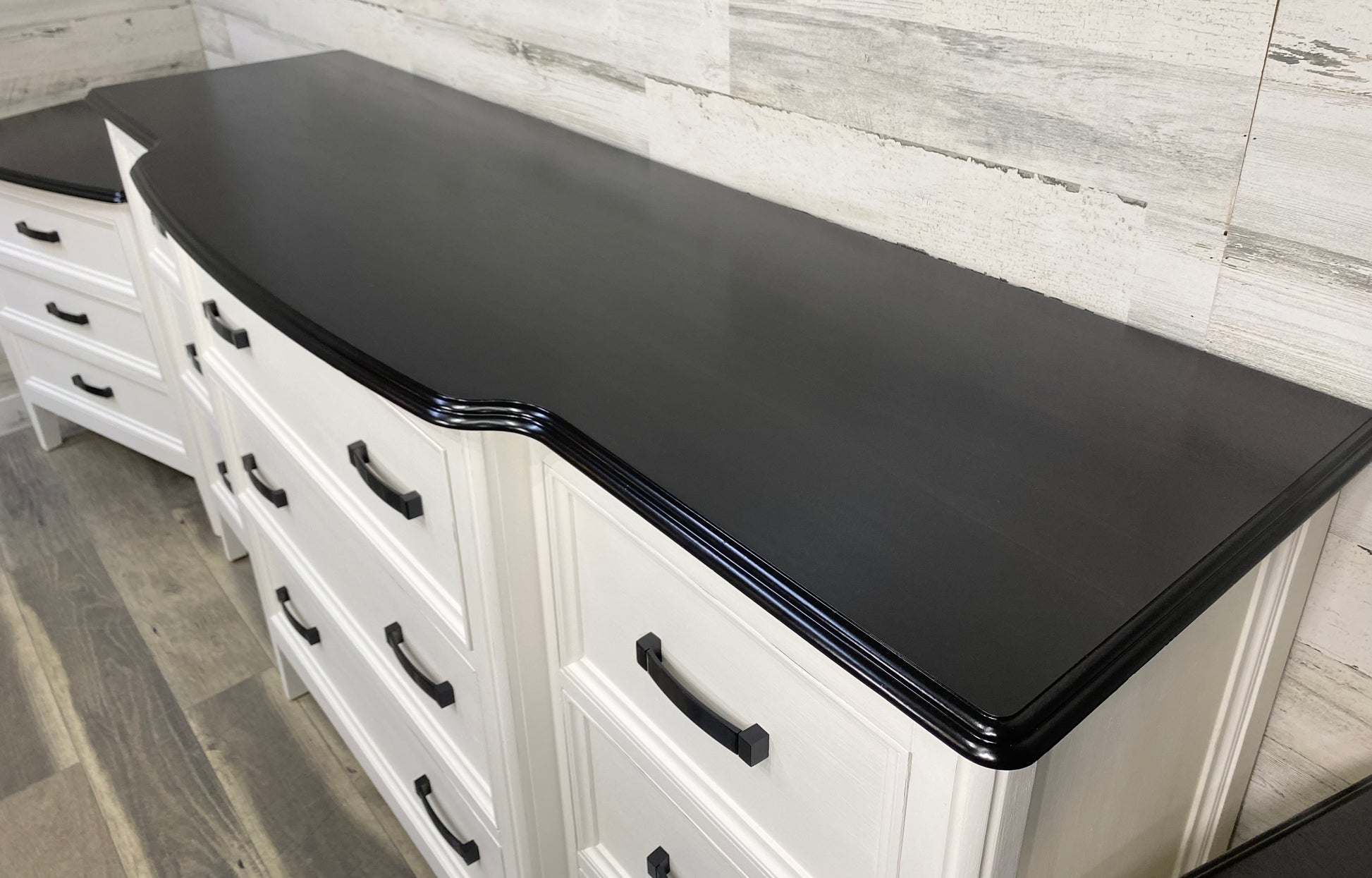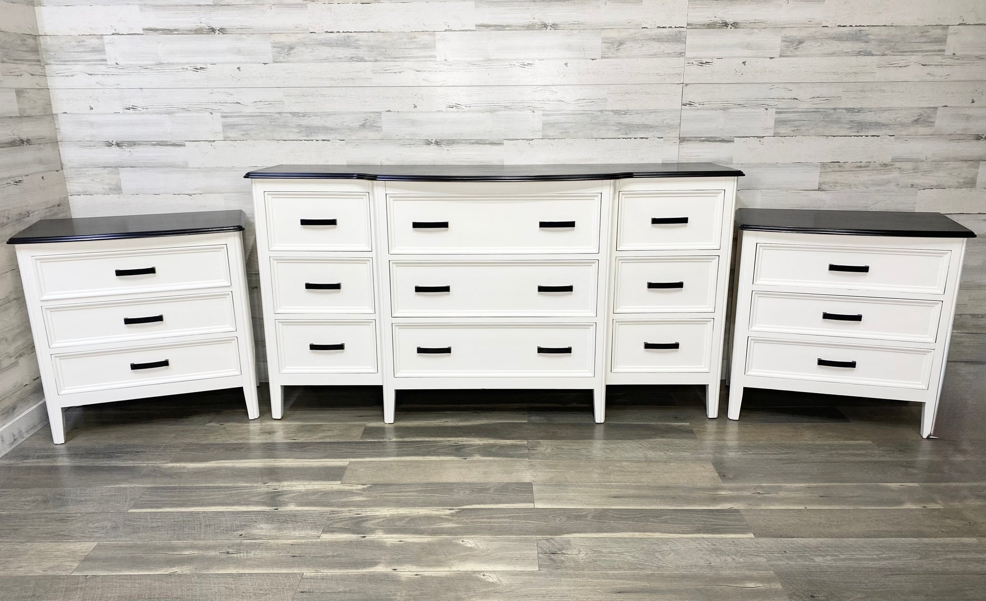 Refinished 3pc dresser set. White large dresser and 2 matching nightstands. Top is dark espresso stain. Drawers on heavy duty gliders and work smoothly.
