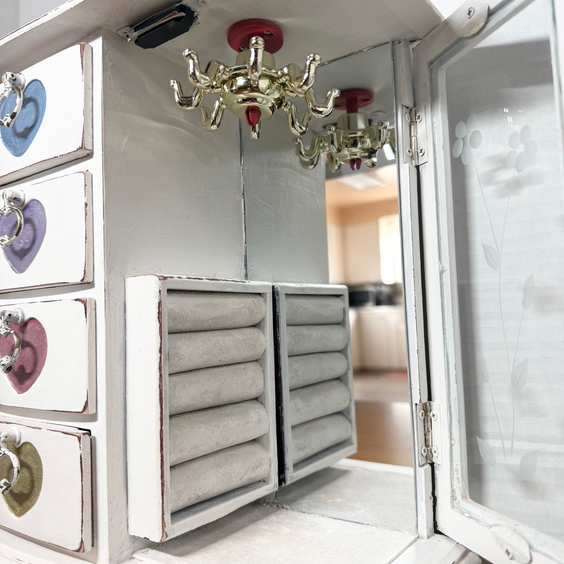 Adorable refinished wooden jewelry box. Desk top size with lots of little hooks and drawers to store all types of jewelry. Glass doors are etched with floral design. One of kind unique piece!