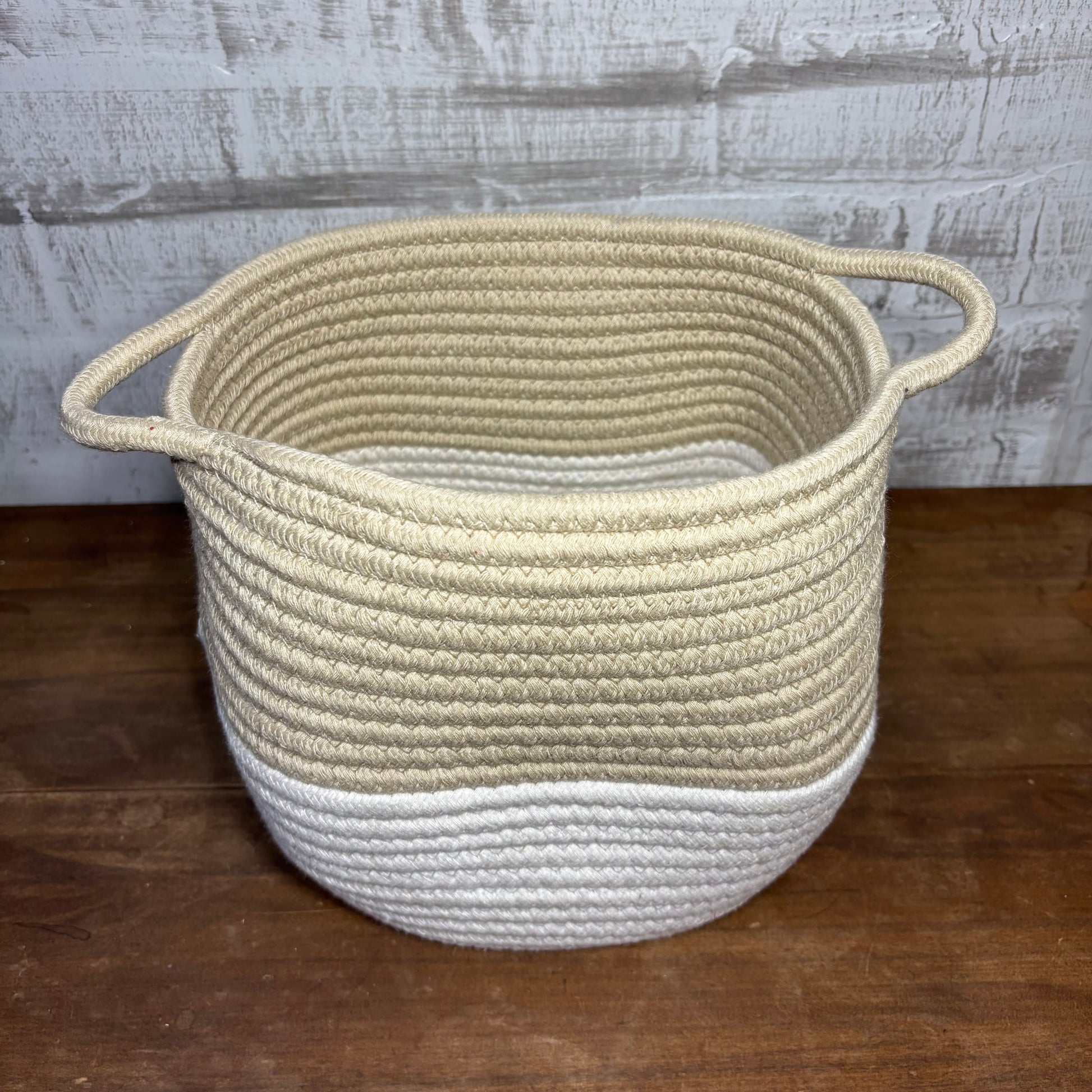 Tan and white two tones, two handle basket, cotton rope woven material, 8” tall, 8” diameter